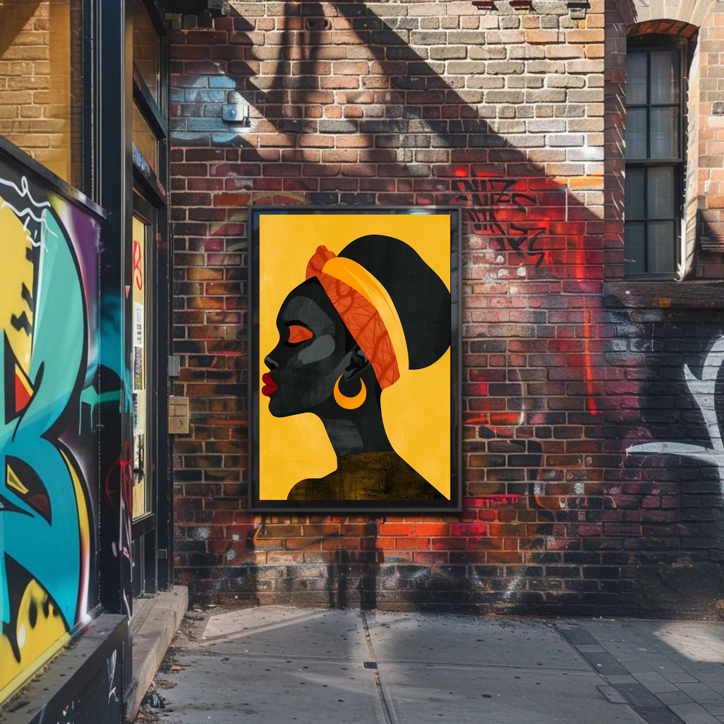 Elevate your space with this striking artistic poster from PosterGoat — a bold, modern illustration of a woman in profile that blends mid-century modern sensibilities with vibrant cultural flair. Set against a rich yellow backdrop, the textured black silhouette, fiery red lips and eye shadow, and patterned orange-red headscarf create a powerful visual contrast that commands attention in any room.