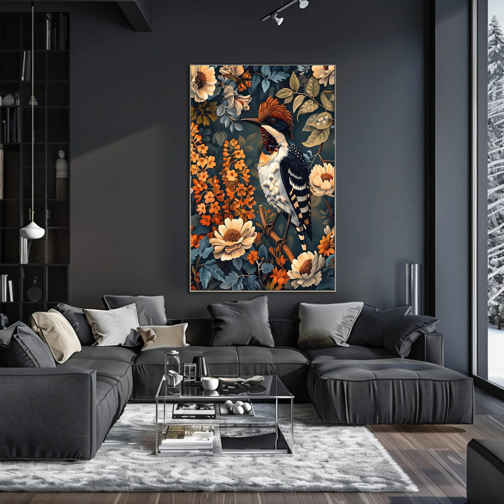 Bring bold nature into your space with the Vibrant Woodpecker Illustration Artistic Poster from PosterGoat. This eye-catching poster features a stylized woodpecker perched on a slender branch, rendered in rich orange, white and black plumage against a deep muted blue backdrop. Lush botanical elements—creamy blossoms, warm orange florals and cool slate leaves—frame the bird in a dramatic Pop Art–inspired composition that draws the eye and anchors any room.