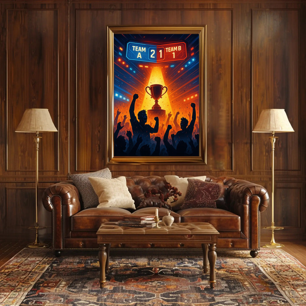 Bring the thrill of victory into your space with the "Victory Trophy Highlighted in Sports Competition Poster" from PosterGoat. This dynamic poster captures a stadium-charged moment: a gleaming trophy bathed in a dramatic spotlight, an animated digital scoreboard declaring Team A the winner, and roaring fan silhouettes and confetti that explode across the composition in bold, energetic hues.