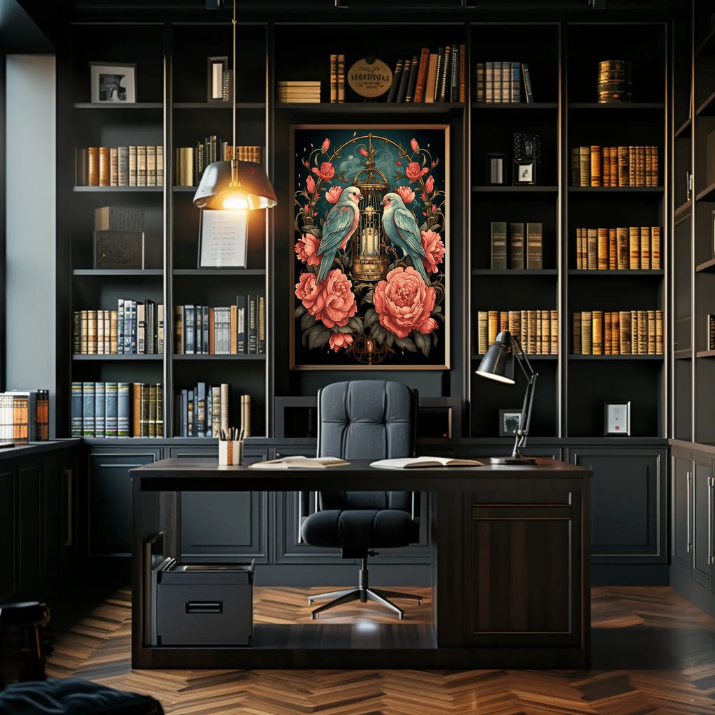 Immerse yourself in the enchantment of this vintage-inspired poster, where two vividly colored birds in teal and pink grace an ornate golden birdcage. Surrounded by lush roses in pink and salmon hues, the intricate illustration captures the essence of nature's beauty. The deep teal background enhances the vibrant colors, creating a striking contrast that highlights the delicate details. With its classical illustration style and Art Nouveau influences, this piece exudes elegance and romance.
