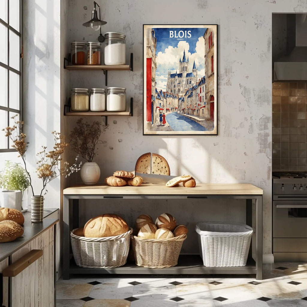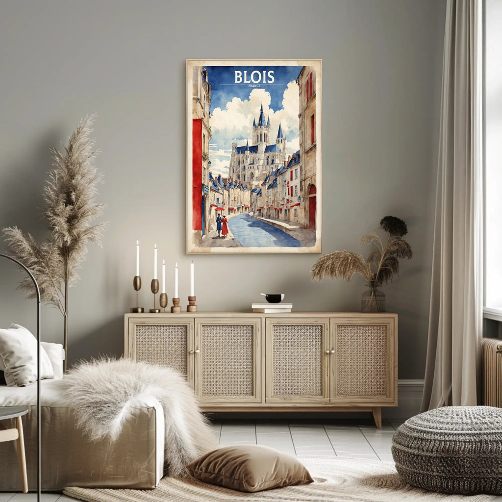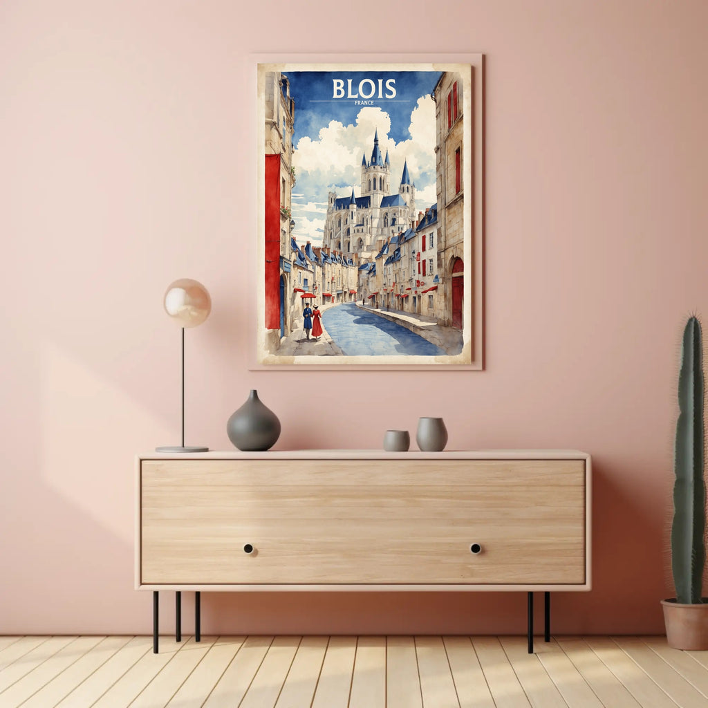 Transport yourself to the charming streets of historic Blois, France, with this exquisite vintage-style illustration. The captivating scene draws you into a picturesque setting, where a quaint street leads your gaze to a stunning cathedral adorned with striking blue spires. Surrounded by a vibrant blue sky dotted with fluffy clouds, classic European architecture comes to life through stone buildings accented in rich reds. Adding to the nostalgic allure, two elegantly dressed figures meander down the street, evoking a sense of serene elegance. This poster beautifully captures Blois’ timeless charm and idyllic essence, making it a perfect addition to any enthusiast's collection.