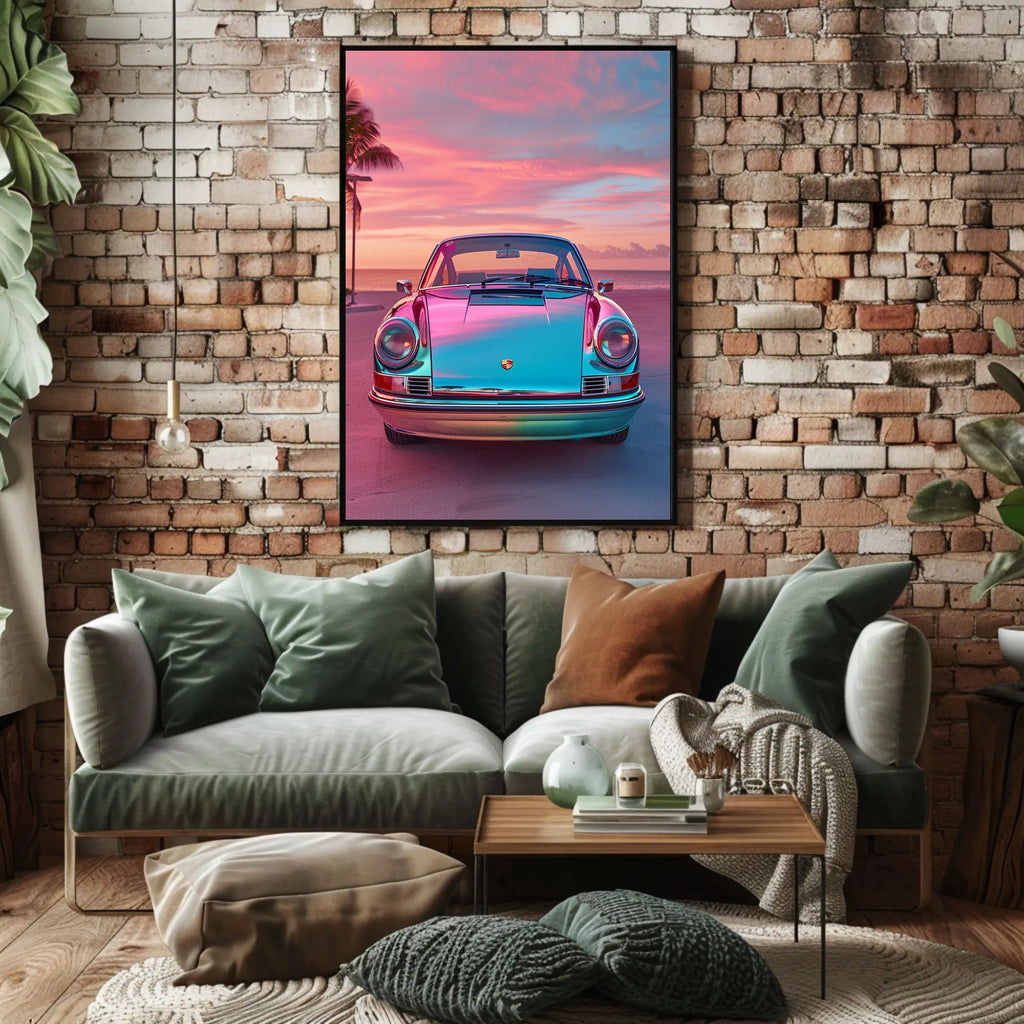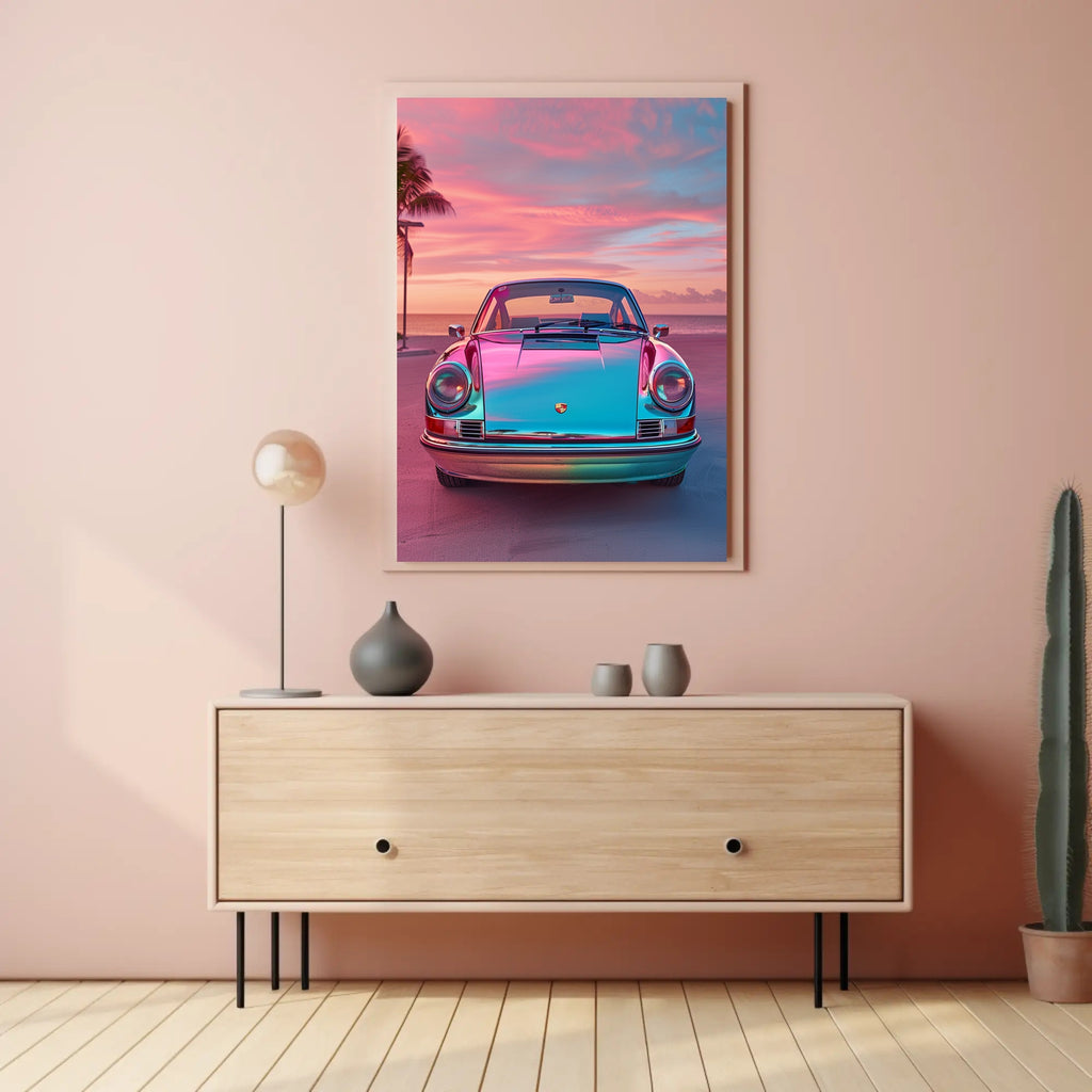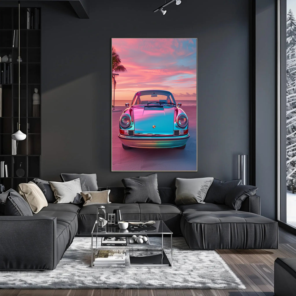 Why you'll love it: The high-contrast composition places the vintage car front-and-center against a cinematic sunset and subtle palm silhouette, creating a nostalgic yet contemporary focal point for living rooms, offices, garages, or studio spaces. The minimalist styling and vivid color grading make it an instant conversation piece.
