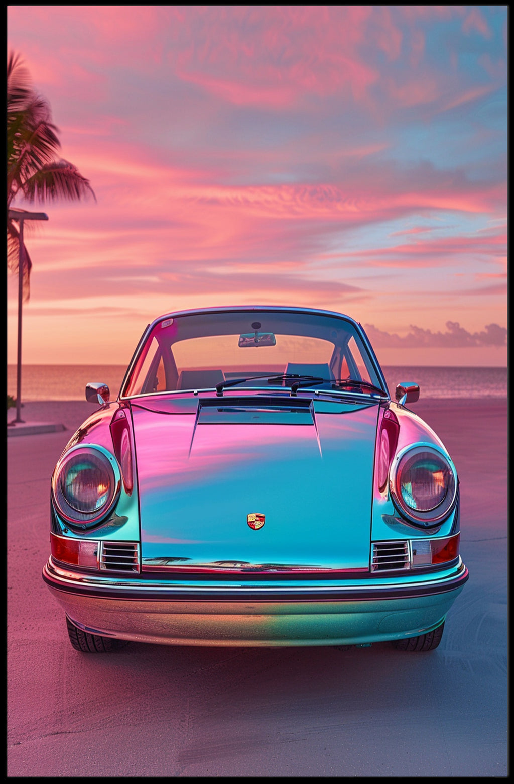 Bring the romance of the open road and a dreamy seaside sunset into your space with the Vintage Car at Sunset Art Print Poster by PosterGoat. This striking print captures a classic sports car viewed head-on, its chrome curves mirroring a pastel sky of pinks and teal—perfect for fans of automotive art, retro style, and scenic wall decor.