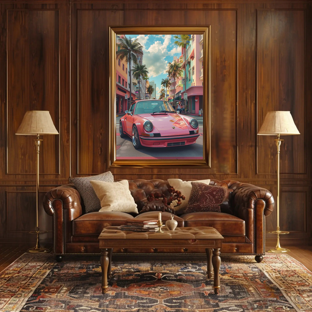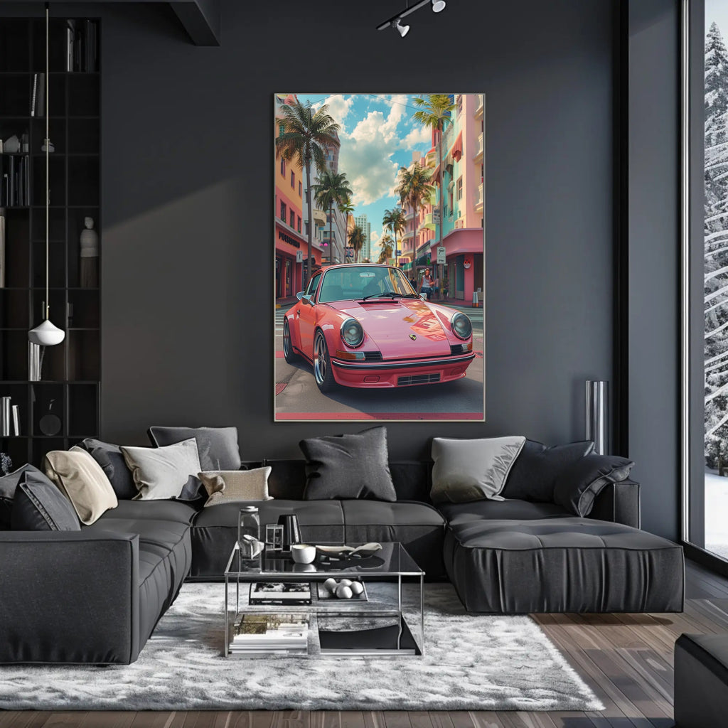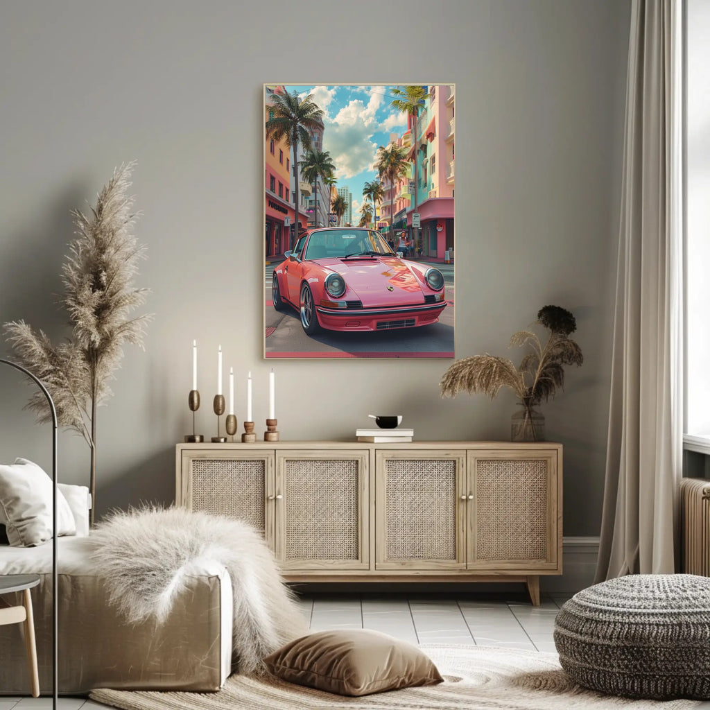 Bring a burst of nostalgia and modern flair to your walls with the Vintage Car in Vibrant Cityscape Art Poster Print from PosterGoat. This Pop Art–inspired poster captures a glossy vintage sports car parked on a sun-drenched avenue lined with palm trees and pastel Art Deco facades — a scenic, wanderlust-fueled scene that livens up living rooms, offices, or studio walls.