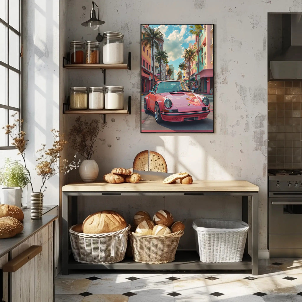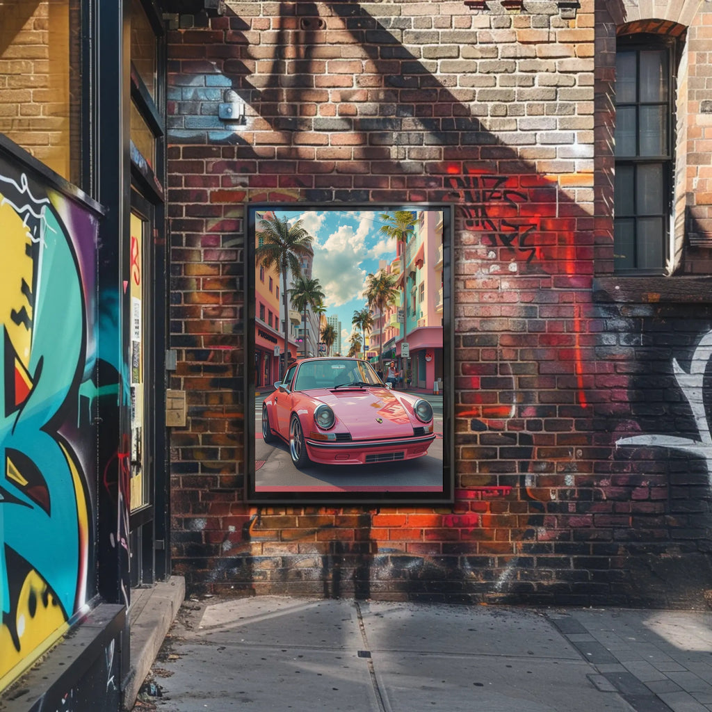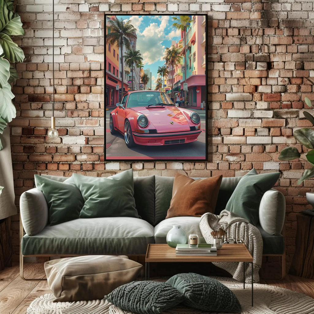 Bring a burst of nostalgia and modern flair to your walls with the Vintage Car in Vibrant Cityscape Art Poster Print from PosterGoat. This Pop Art–inspired poster captures a glossy vintage sports car parked on a sun-drenched avenue lined with palm trees and pastel Art Deco facades — a scenic, wanderlust-fueled scene that livens up living rooms, offices, or studio walls.