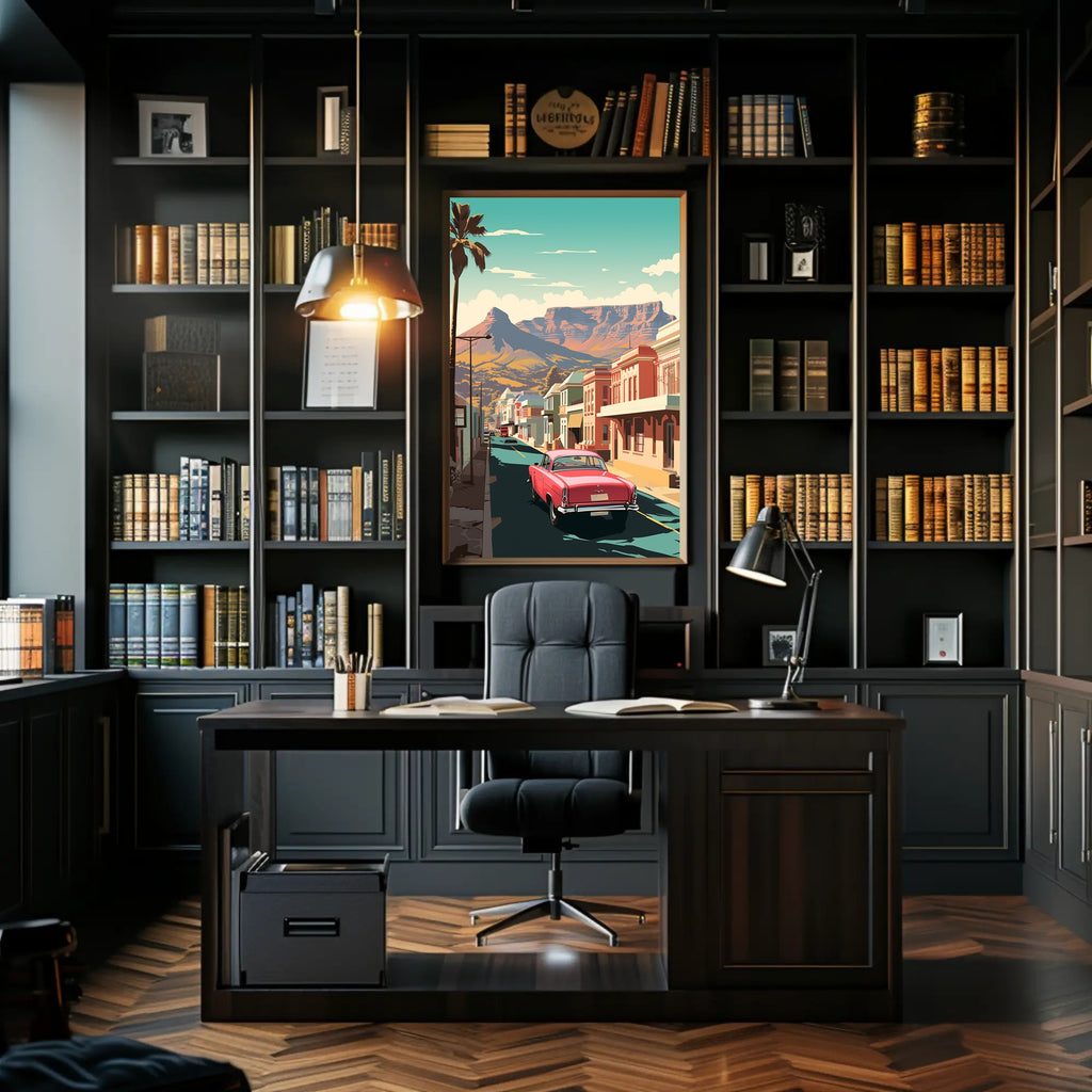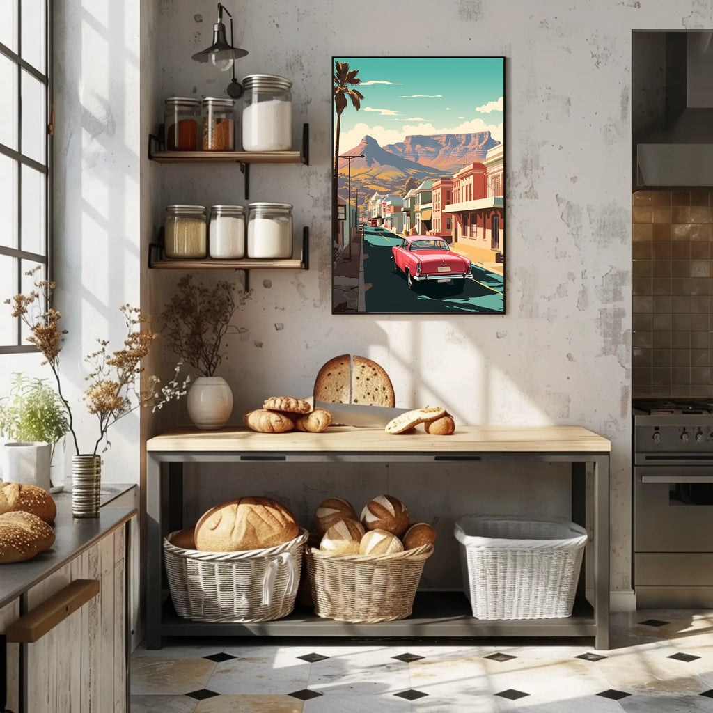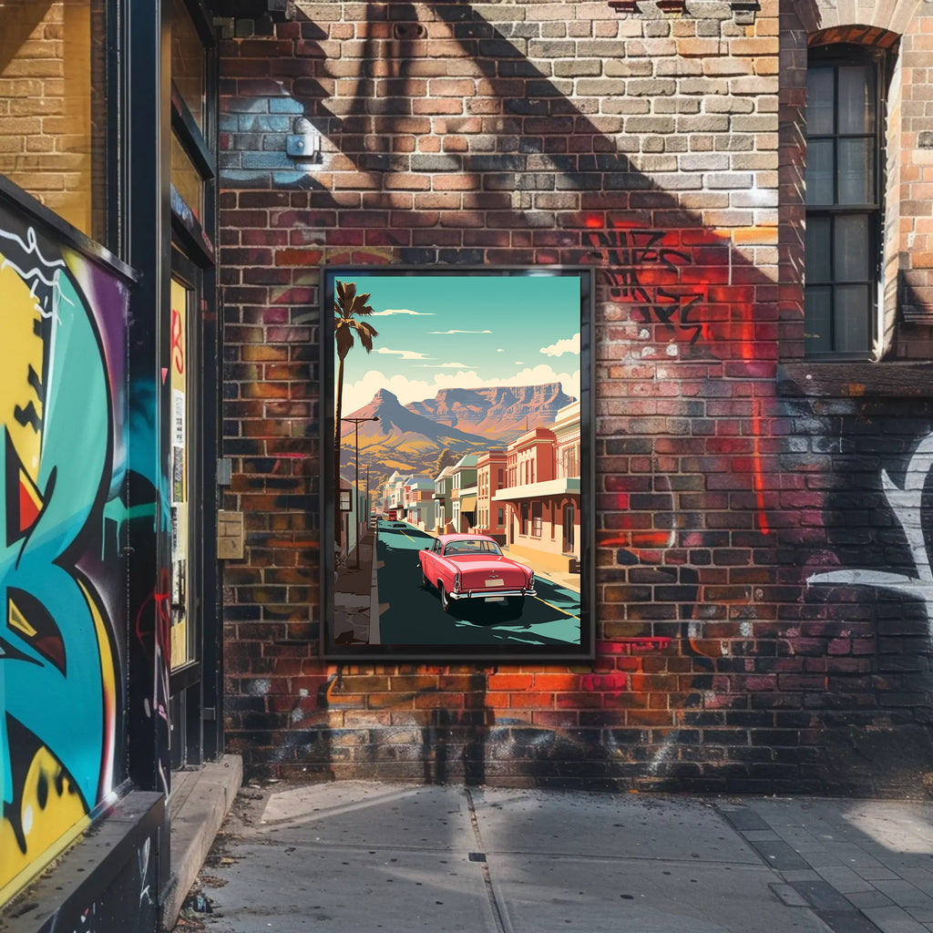 Immerse yourself in a nostalgic journey with this vintage-inspired poster that channels the essence of mid-20th century Americana. A classic red car takes center stage as it cruises down a serene street in a small town reminiscent of the American Southwest. The scene is adorned with vibrant buildings reflecting the bold architectural styles of the era, while a tall palm tree and majestic mountains enhance the tranquil rural landscape. The minimalist design and striking colors evoke a sense of peaceful exploration, capturing the spirit of retro travel art that is both captivating and timeless.