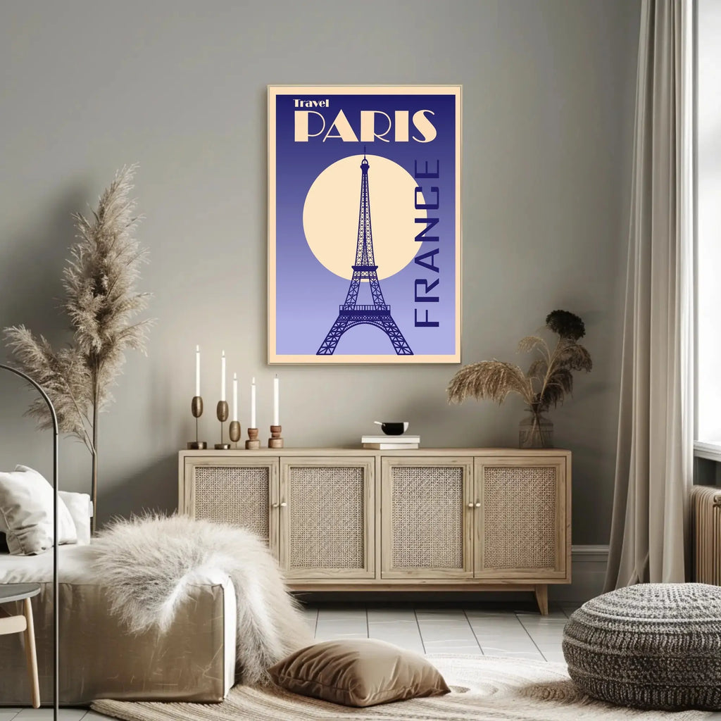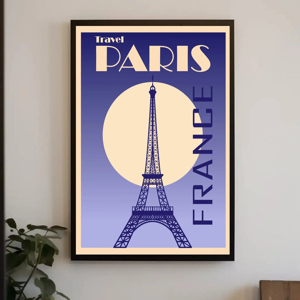 Rendered in a rich gradient of indigo and lavender, the poster features a bold cream sun behind a finely detailed Eiffel Tower silhouette, framed by geometric type and an elegant retro typeface. The high-contrast composition and minimalist color palette evoke classic travel posters while adding contemporary sophistication to home and office decor.