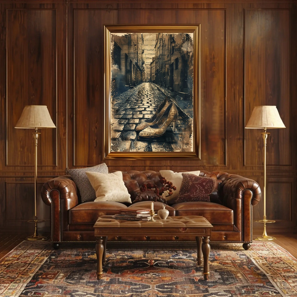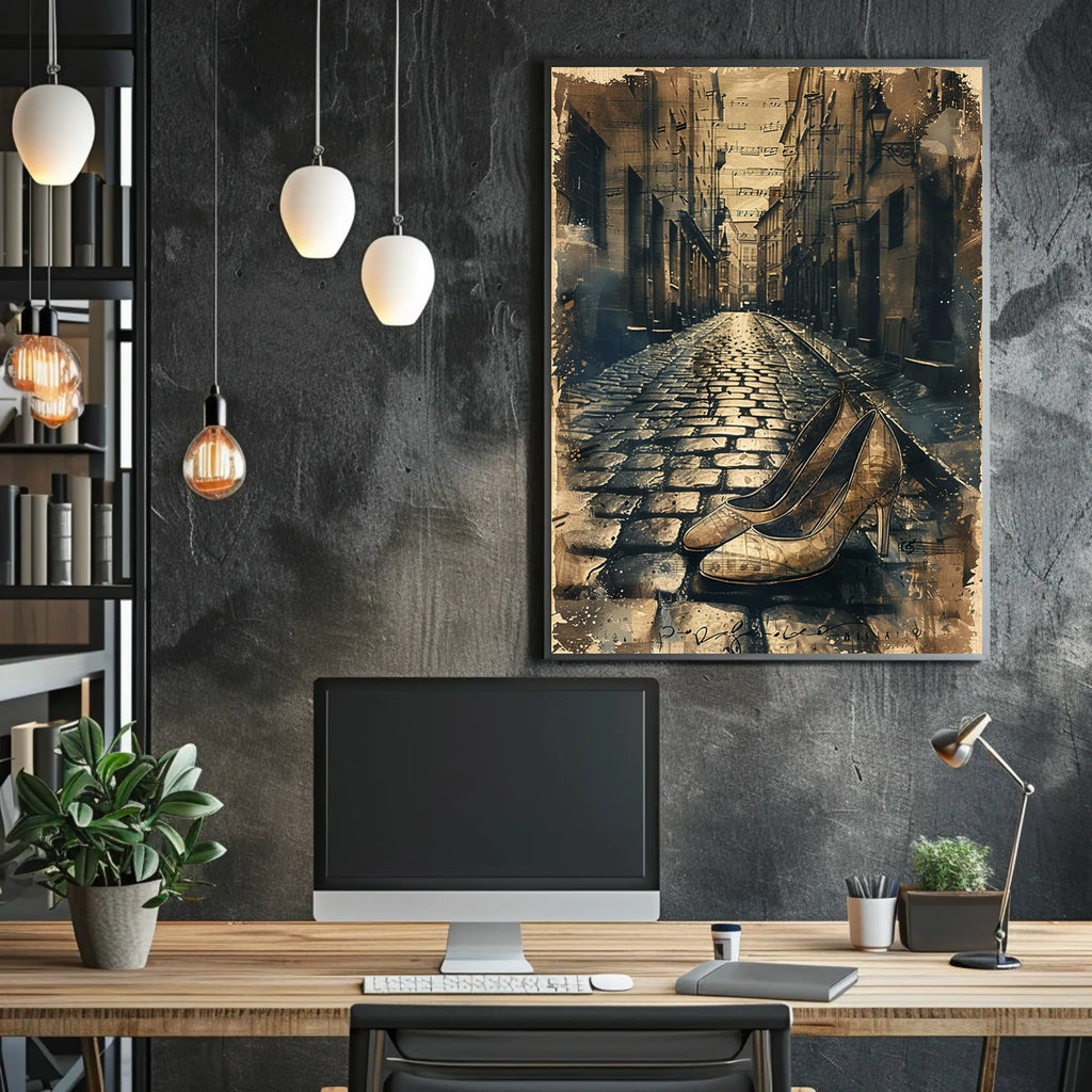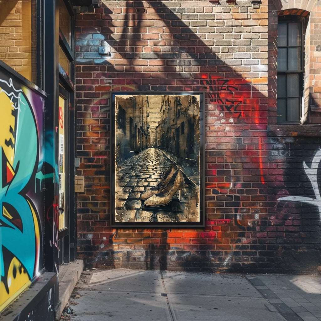 Vintage Elegance: Musical High Heels Art Poster celebrates the beauty of fashion, melody, and history in a single timeless wall art piece. Set on a cobblestone European street, the sepia-toned backdrop transports you to a historic era, while a pair of high-heeled shoes adorned with musical notes captures elegance and creativity. The fusion of photorealism, collage, and vintage illustration creates a nostalgic mood that invites art enthusiasts and history lovers alike to pause, reflect, and be inspired.