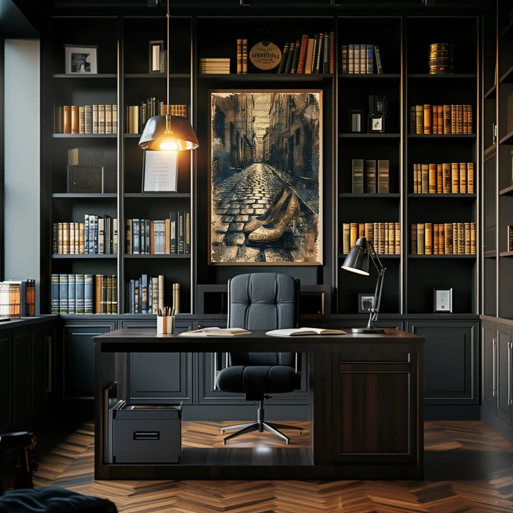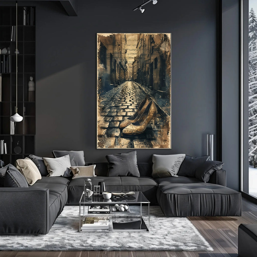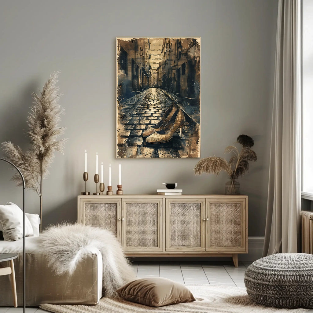 Vintage Elegance: Musical High Heels Art Poster celebrates the beauty of fashion, melody, and history in a single timeless wall art piece. Set on a cobblestone European street, the sepia-toned backdrop transports you to a historic era, while a pair of high-heeled shoes adorned with musical notes captures elegance and creativity. The fusion of photorealism, collage, and vintage illustration creates a nostalgic mood that invites art enthusiasts and history lovers alike to pause, reflect, and be inspired.