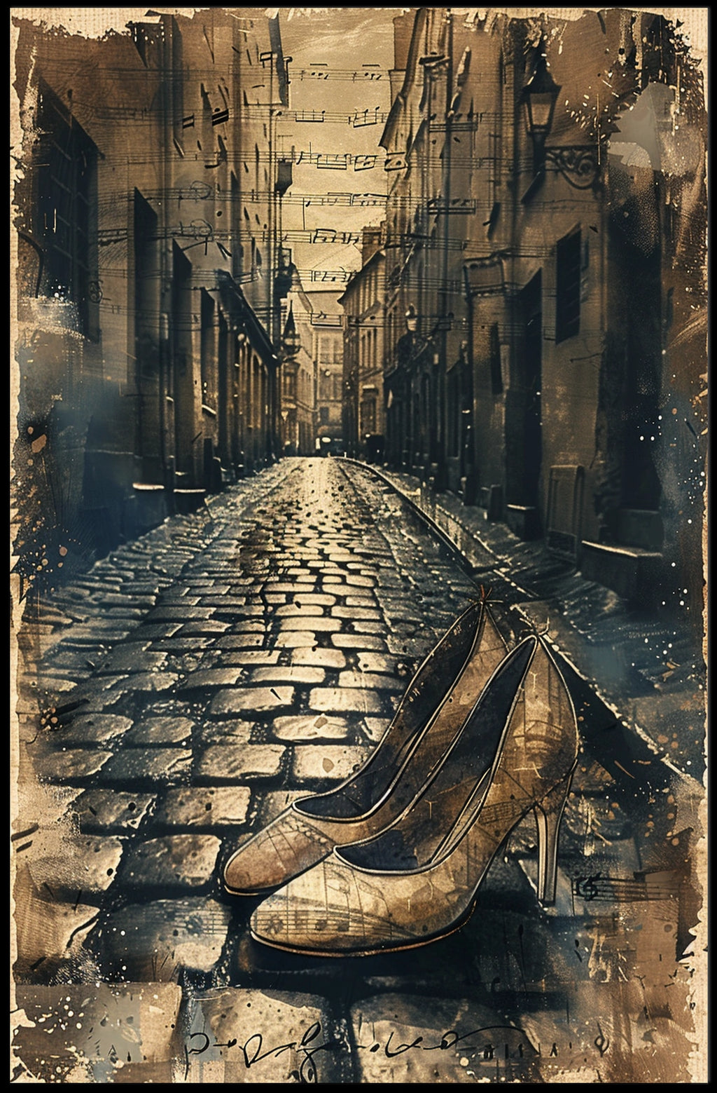 - Detailed design highlighting the blend of photorealism, collage, and vintage illustration—featuring a cobblestone European street and high-heeled shoes adorned with musical notes