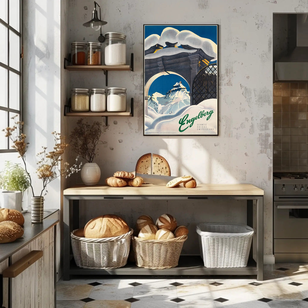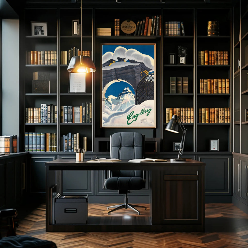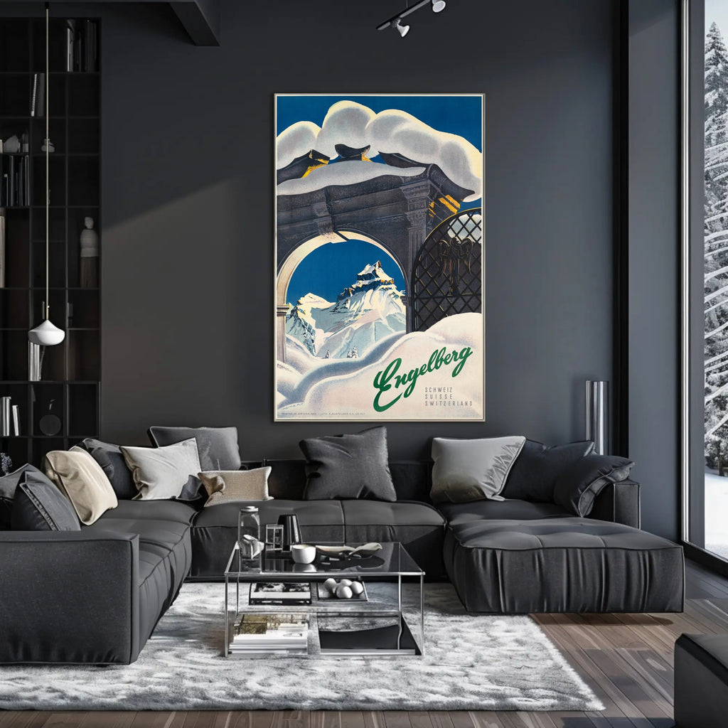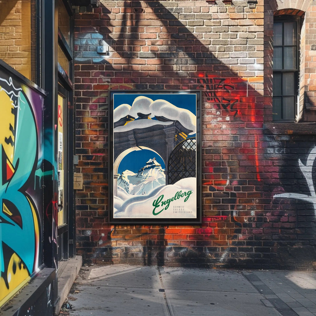 Experience the allure of Engelberg, Switzerland with this exquisite vintage travel poster. The artwork beautifully captures the serene beauty of a majestic snow-covered mountain, framed by a grand architectural arch and surrounded by snow-laden structures. This picturesque winter landscape is rendered in a classic, illustrative style typical of mid-20th-century travel advertisements. The arch serves as a welcoming gateway, inviting you to explore and embrace adventure. The bold, cursive green text "Engelberg" elegantly contrasts against the snowy backdrop, emphasizing the tranquility and allure of this Swiss winter wonderland. Perfect for travel enthusiasts and vintage art collectors alike.