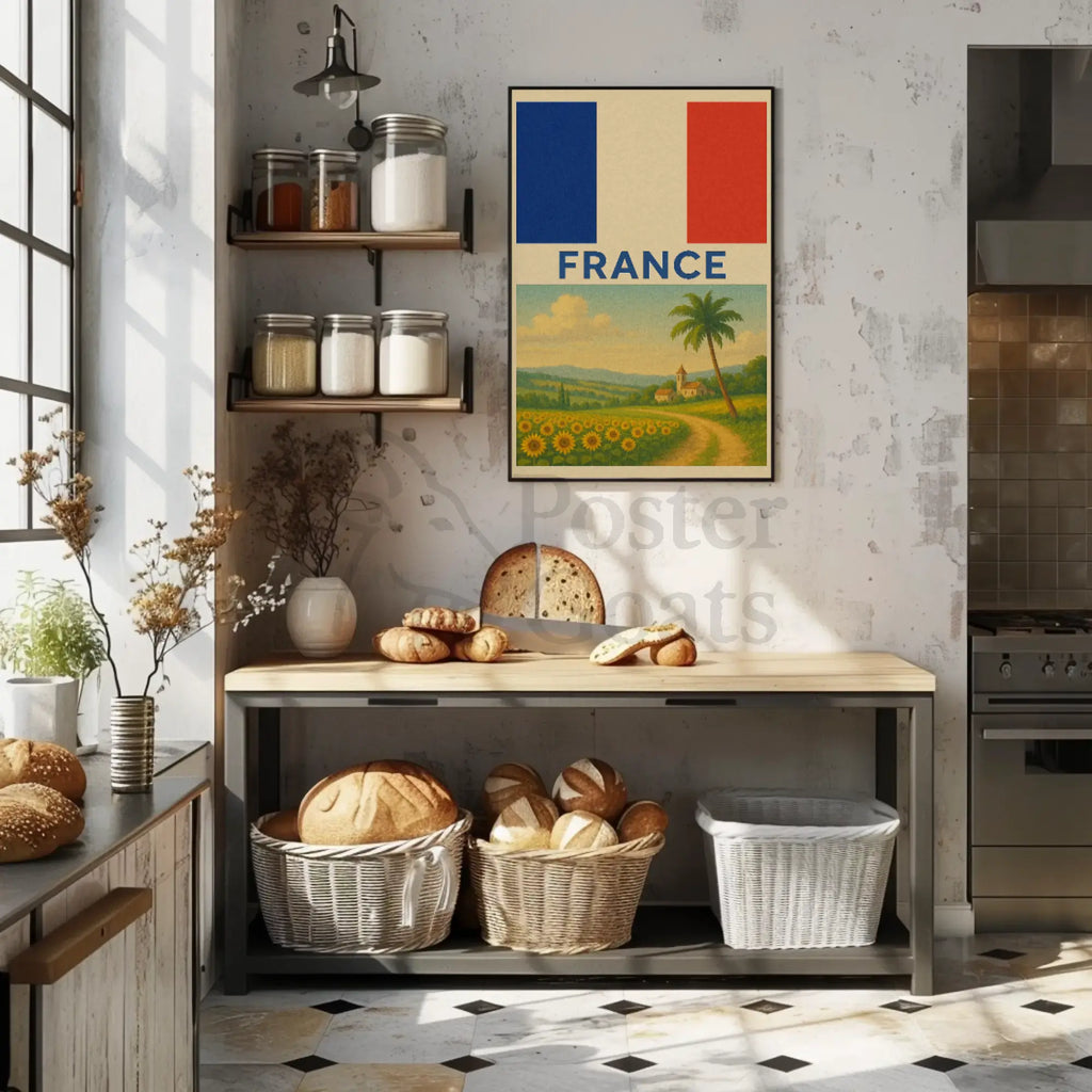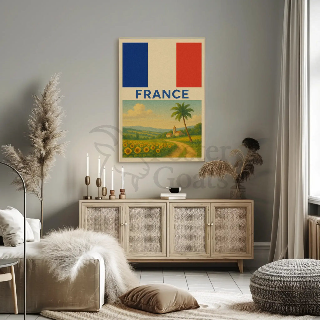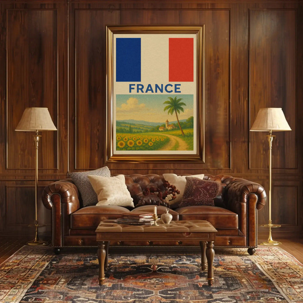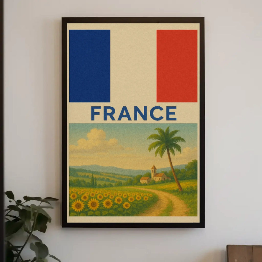 - Iconic imagery: Sunflower field, winding path, village church, and French flag motif — perfect for France wall art and scenic French posters.