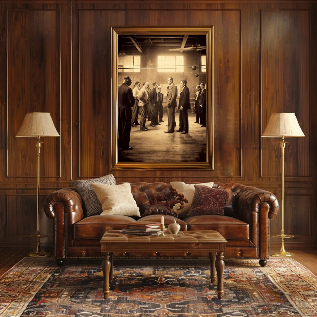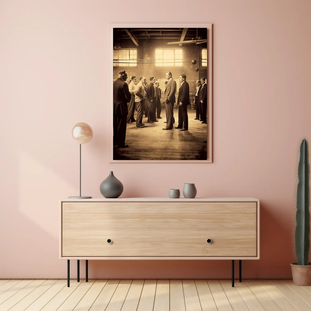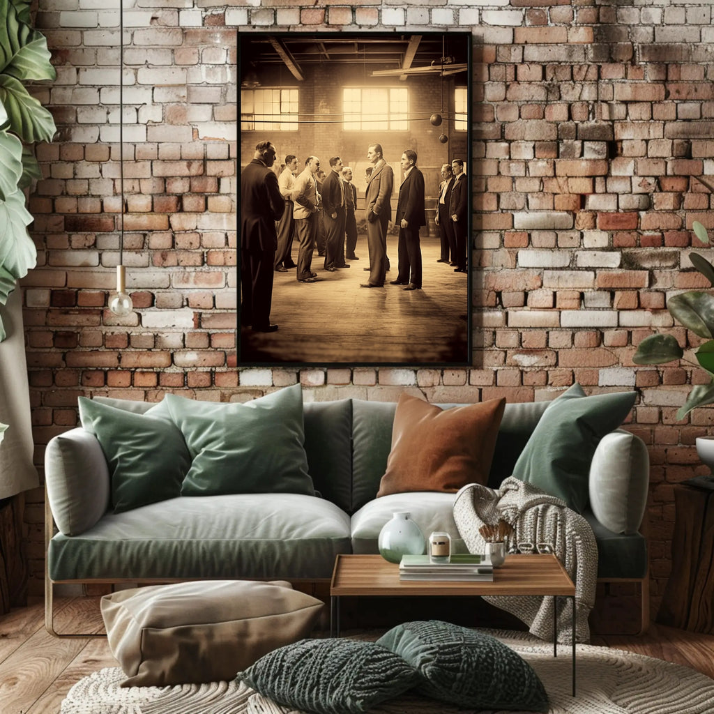 Vintage Gathering in a Boxing Gym captures a bygone moment with warm sepia tones, sunlit factory windows and a row of focused men standing within the ropes of an old-school boxing gym. This PosterGoat original blends nostalgic travel-poster charm with minimalist composition to bring rustic, athletic energy to any wall.