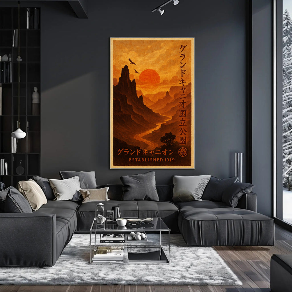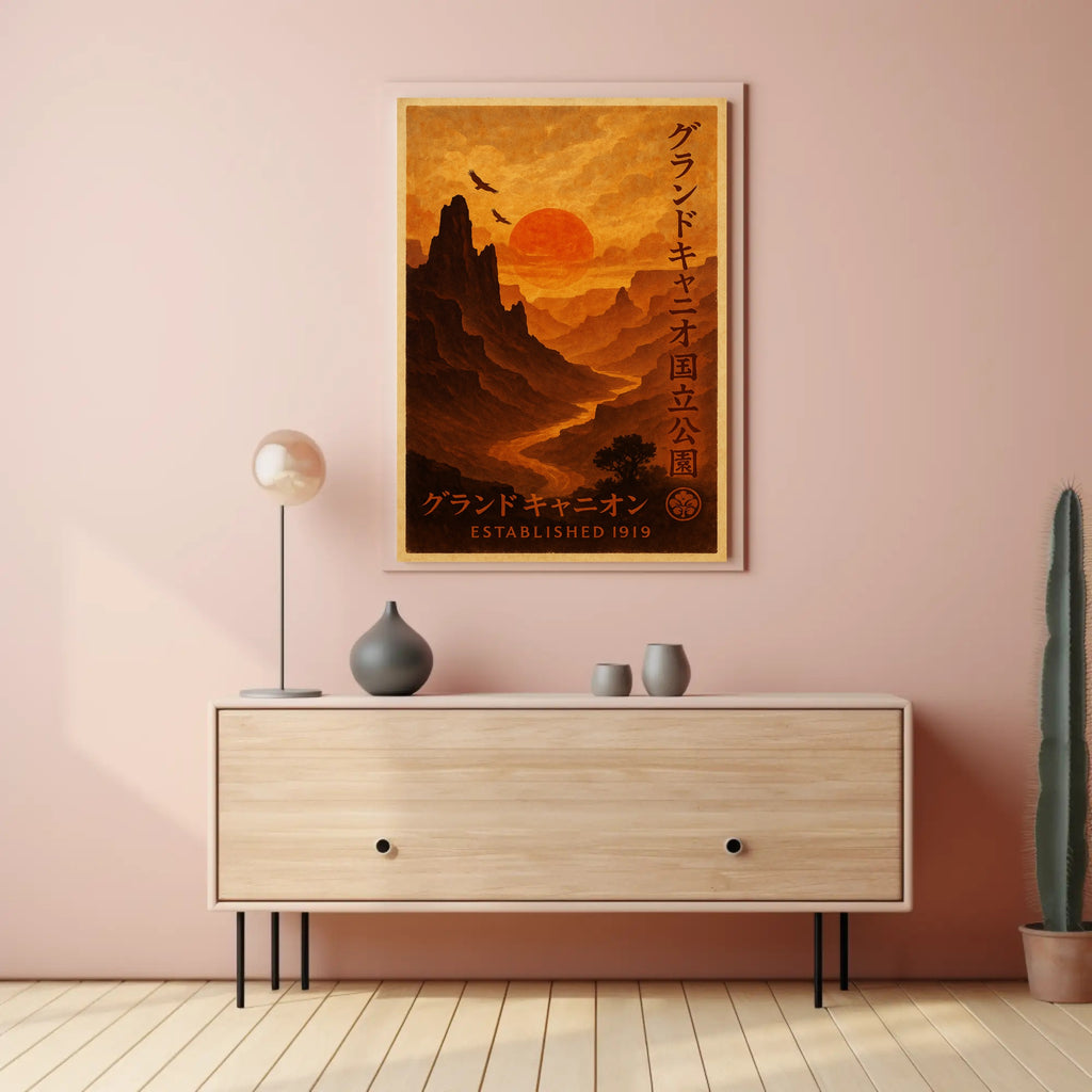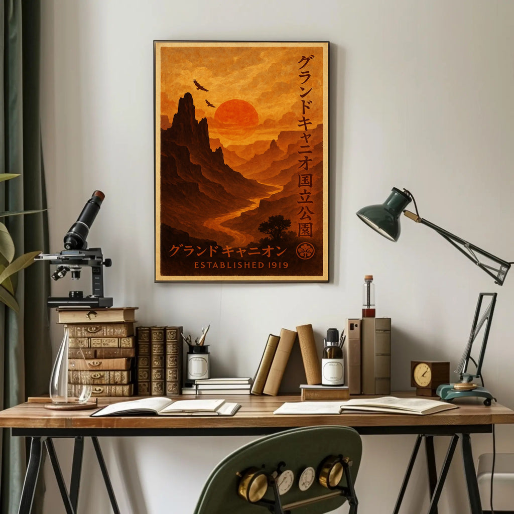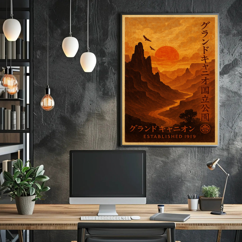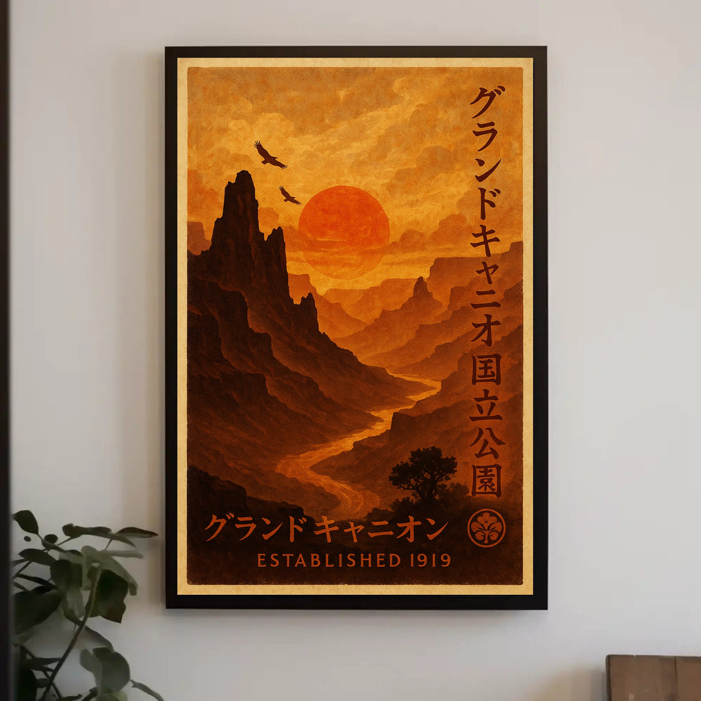 Evoke the timeless grandeur of the American Southwest with the Vintage Grand Canyon Sunrise Travel Poster from PosterGoat — a museum-quality poster that blends vintage travel charm with Japanese-inspired typography and earthy sunrise tones. This evocative illustration captures the canyon’s layered rock formations in deep sepia silhouettes, a glowing red-orange sun framed by textured clouds, and a winding river that draws the eye through the dramatic landscape. Two soaring birds add motion and scale, creating a composition that feels both cinematic and serene.