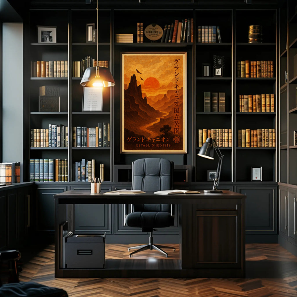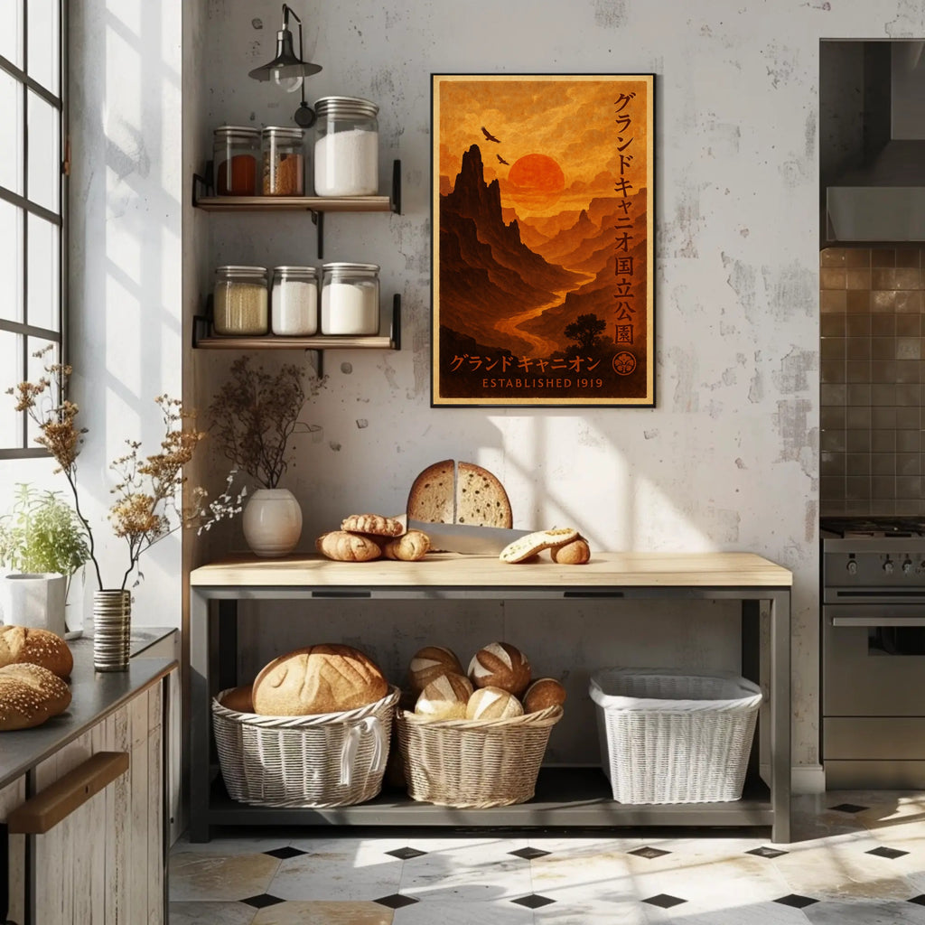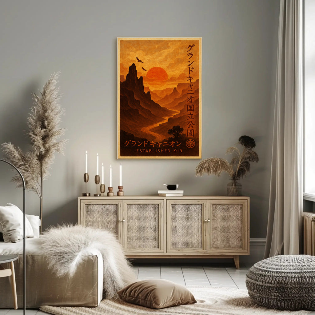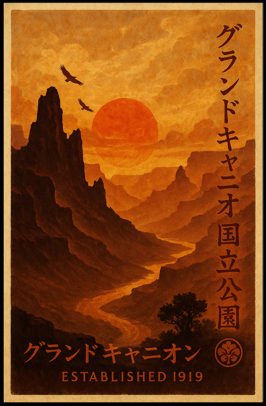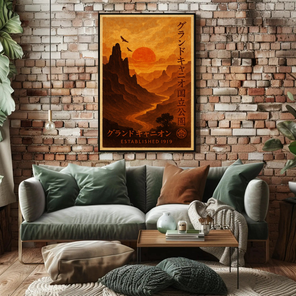Evoke the timeless grandeur of the American Southwest with the Vintage Grand Canyon Sunrise Travel Poster from PosterGoat — a museum-quality poster that blends vintage travel charm with Japanese-inspired typography and earthy sunrise tones. This evocative illustration captures the canyon’s layered rock formations in deep sepia silhouettes, a glowing red-orange sun framed by textured clouds, and a winding river that draws the eye through the dramatic landscape. Two soaring birds add motion and scale, creating a composition that feels both cinematic and serene.