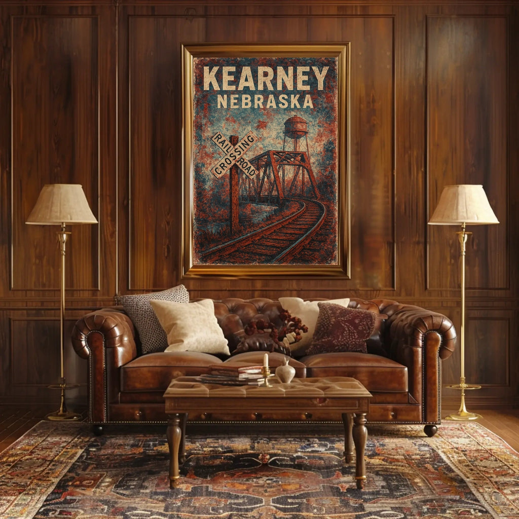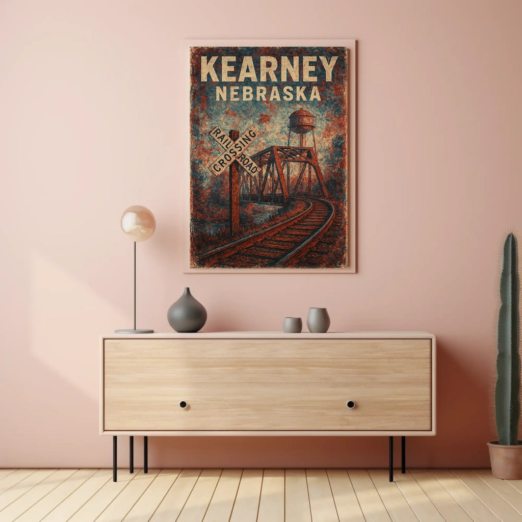 Dive into the rich history of Kearney, Nebraska, with this vintage-style poster that beautifully highlights key elements of Americana. Featuring a centrally curving railroad track leading to a sturdy metal bridge, it conjures the heyday of railroads in small-town America. An iconic railroad crossing sign and a classic water tower evoke nostalgia and a sense of American pride. With a palette of weathered reds and blues, the poster captures the essence of an era gone by. This textured, rustic artwork is the perfect addition for those who appreciate historical significance and transport-themed decor.