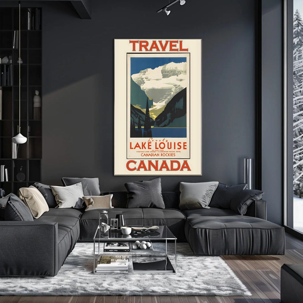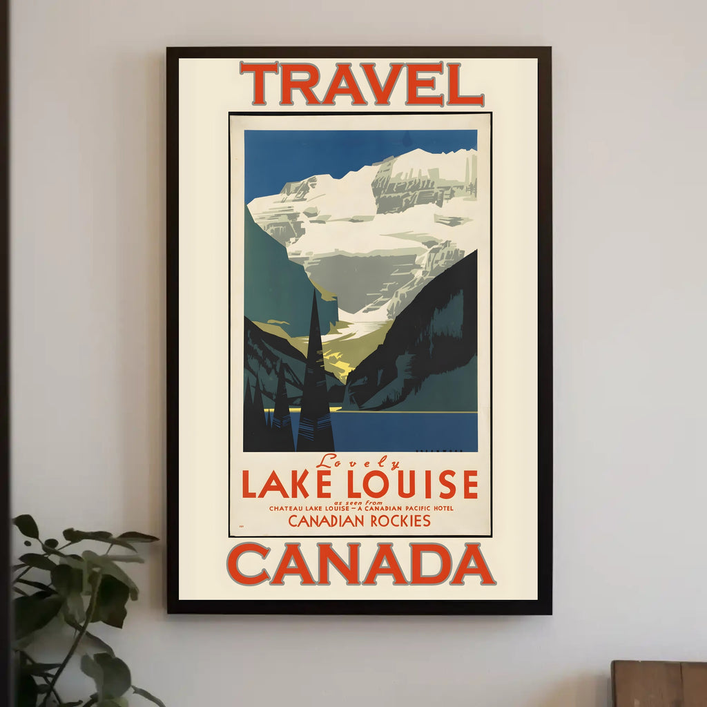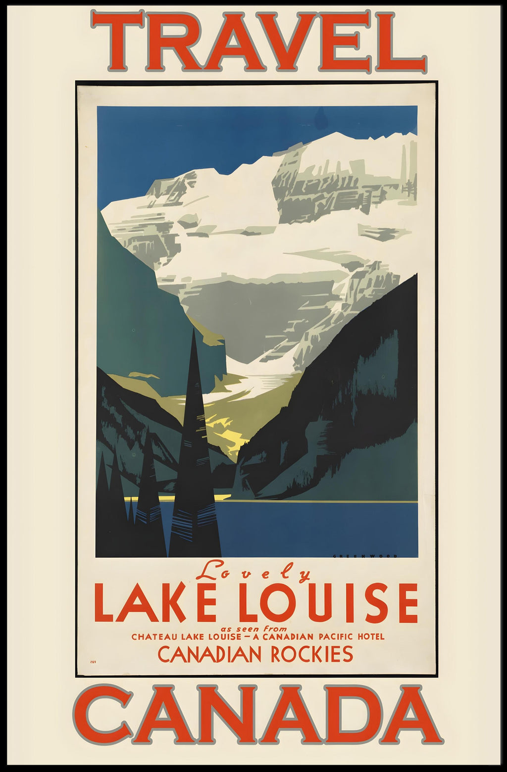 Experience the serene beauty of Lake Louise with this exquisite vintage travel advertisement showcasing the iconic landscape of the Canadian Rockies. The stylized picturesque scene captures snowy peaks, a tranquil lake, and lush coniferous trees, perfect for adding a touch of elegance and wanderlust to any space. The harmonious blend of blues, greens, and muted hues evokes a sense of tranquility and adventure ideal for reminding you of the vast beauty of the natural world. This poster is a striking addition to any room's décor, perfect for nature lovers and travel enthusiasts alike.