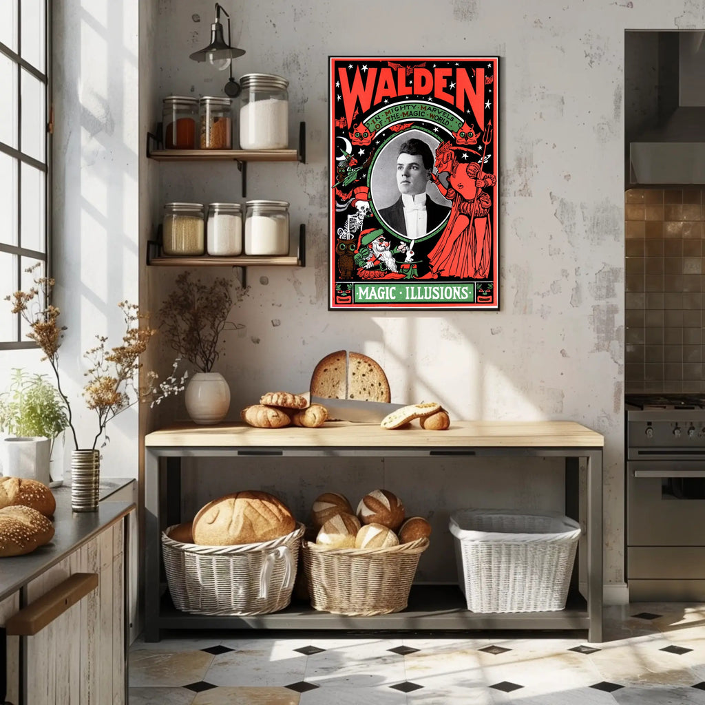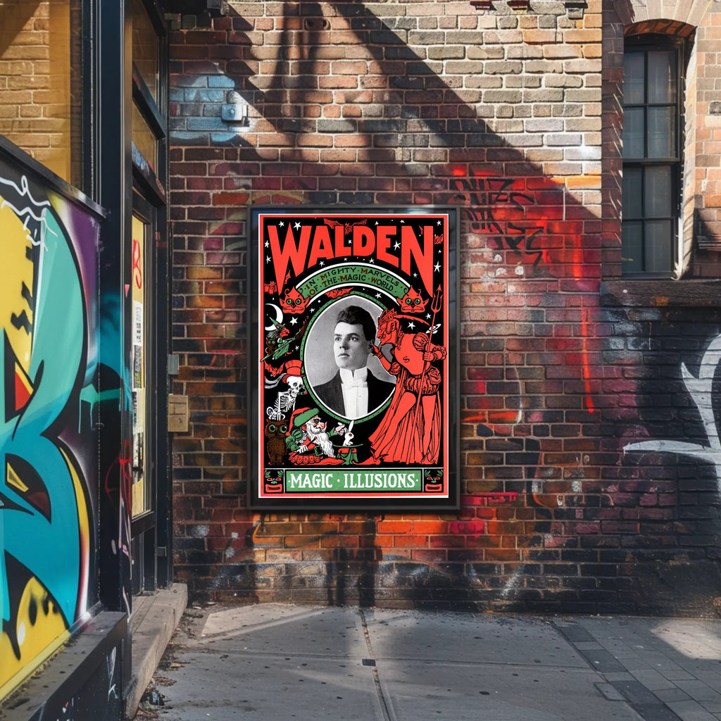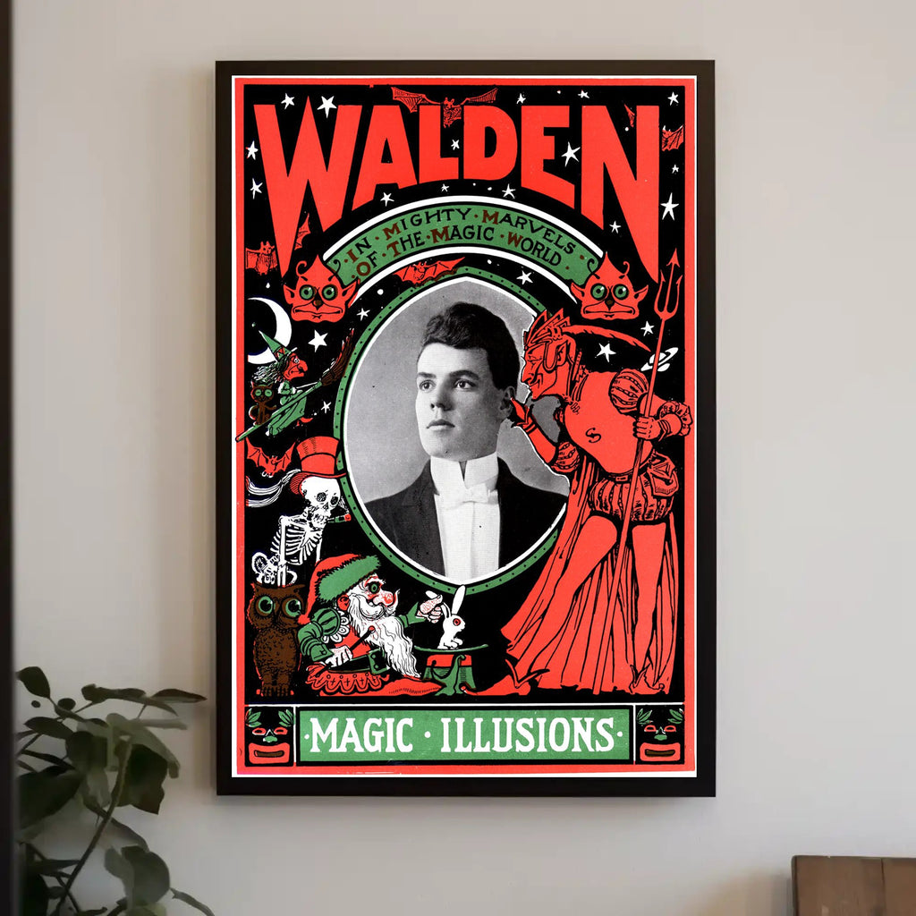 Step into a world of enchantment with the Vintage Magician Illusion Poster from PosterGoat — a theatrical, nostalgia-rich artwork that brings classic magic-house charm to any room. Bold red and black framing, crisp green accents, and a central photoreal portrait surrounded by whimsical devils, owls, skeletons and a rabbit-in-hat tableau create a striking optical-illusion composition that instantly commands attention.