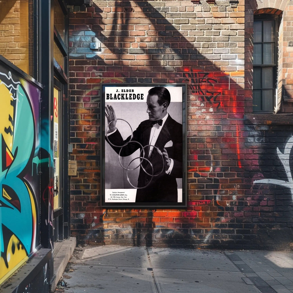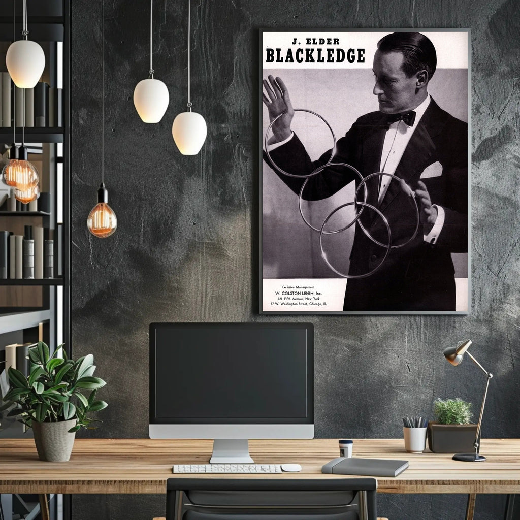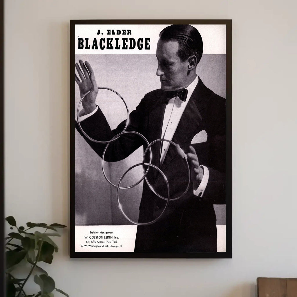 Bring a touch of old-world spectacle to your walls with this Vintage Magician Illusionist Poster from the Mid-20th Century Era by PosterGoat. Rendered in striking black-and-white photography, the poster captures a dapper illusionist in tuxedo performing the classic linking rings — a timeless image that blends Mid-Century Modern flair with nostalgic showmanship.