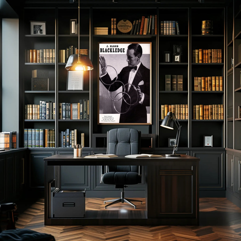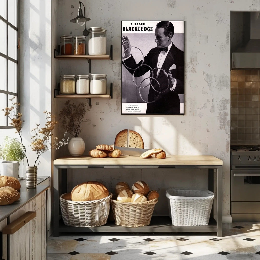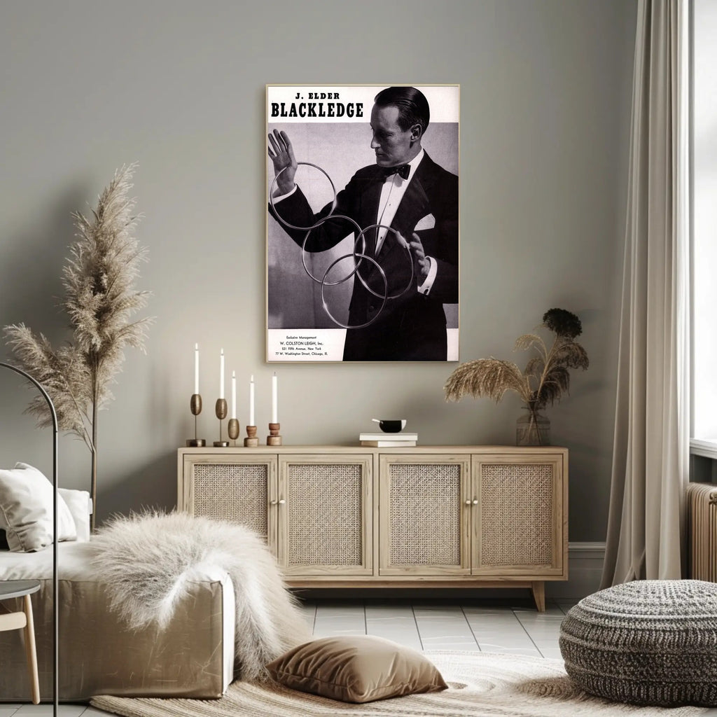 Bring a touch of old-world spectacle to your walls with this Vintage Magician Illusionist Poster from the Mid-20th Century Era by PosterGoat. Rendered in striking black-and-white photography, the poster captures a dapper illusionist in tuxedo performing the classic linking rings — a timeless image that blends Mid-Century Modern flair with nostalgic showmanship.