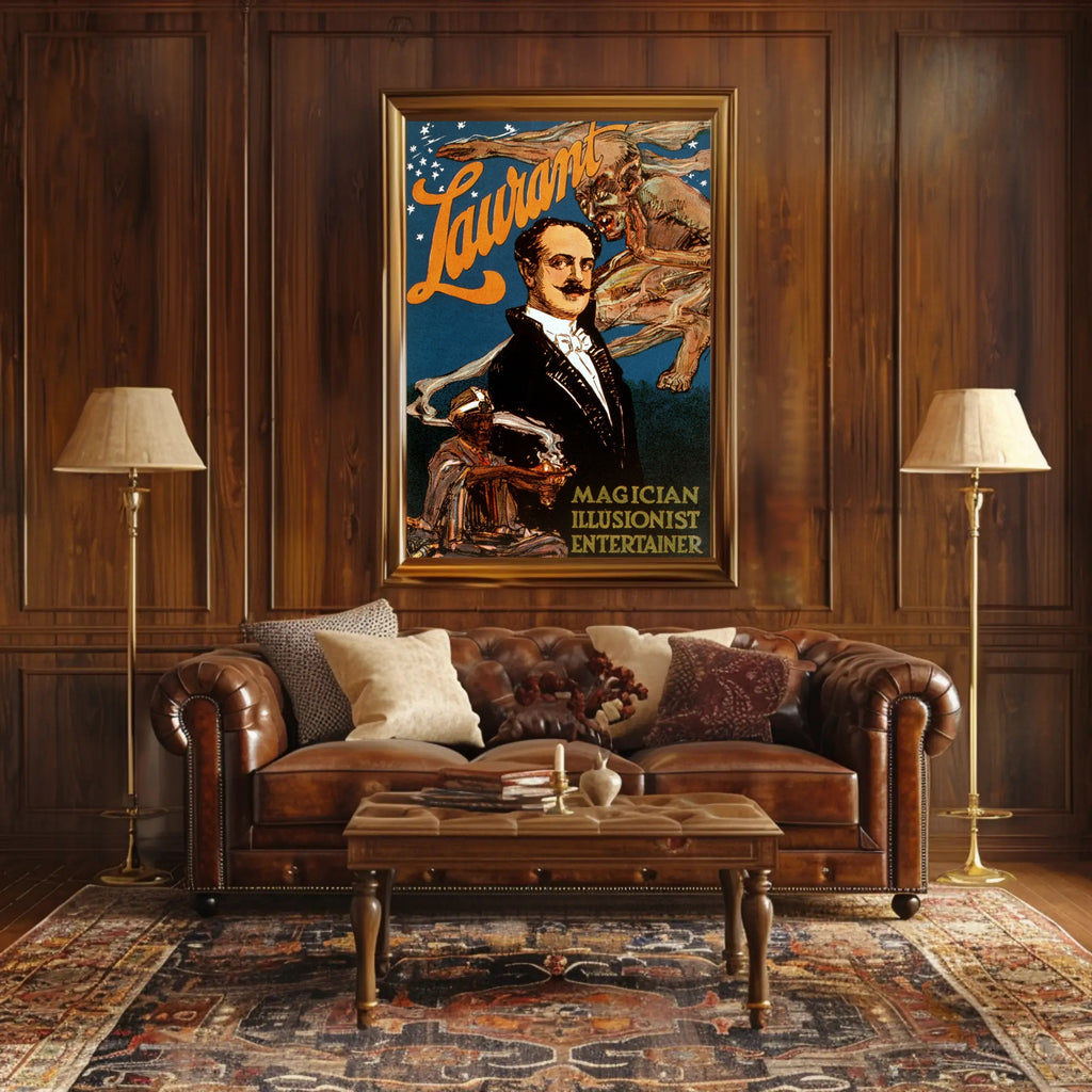 Vintage Magician Laurant Drama Poster — a dramatic, museum-quality reproduction from PosterGoat that brings the mystery and theatrical flair of classic illusionists into your home. This striking historical poster features a hand-drawn portrait of Laurant in a polished tuxedo, set against a deep blue field with sweeping orange script, ghostly phantoms and smoky, mystical flourishes that evoke turn-of-the-century stage magic.