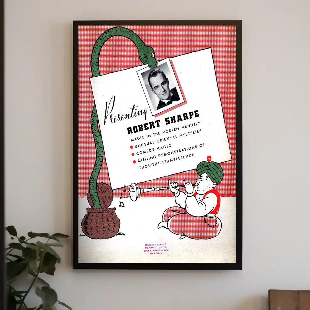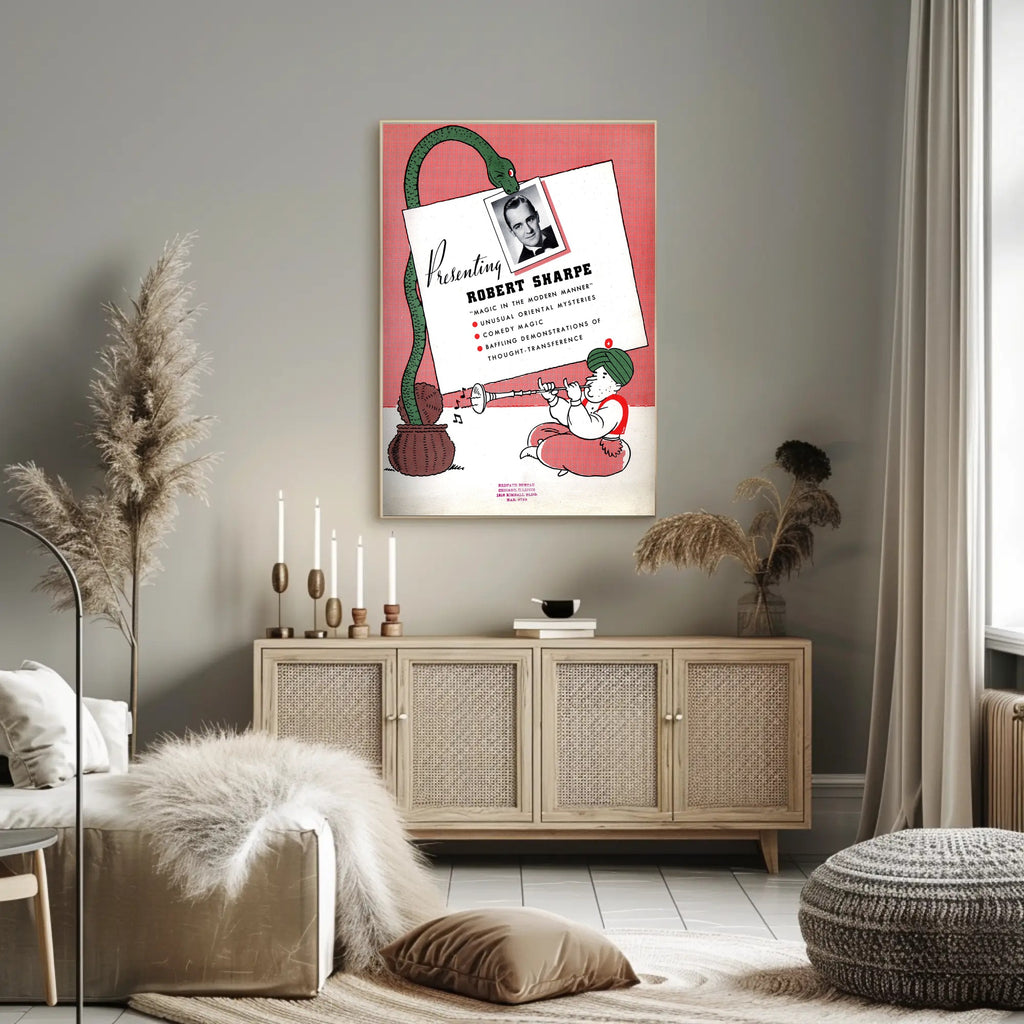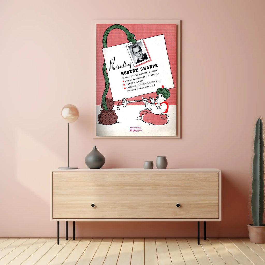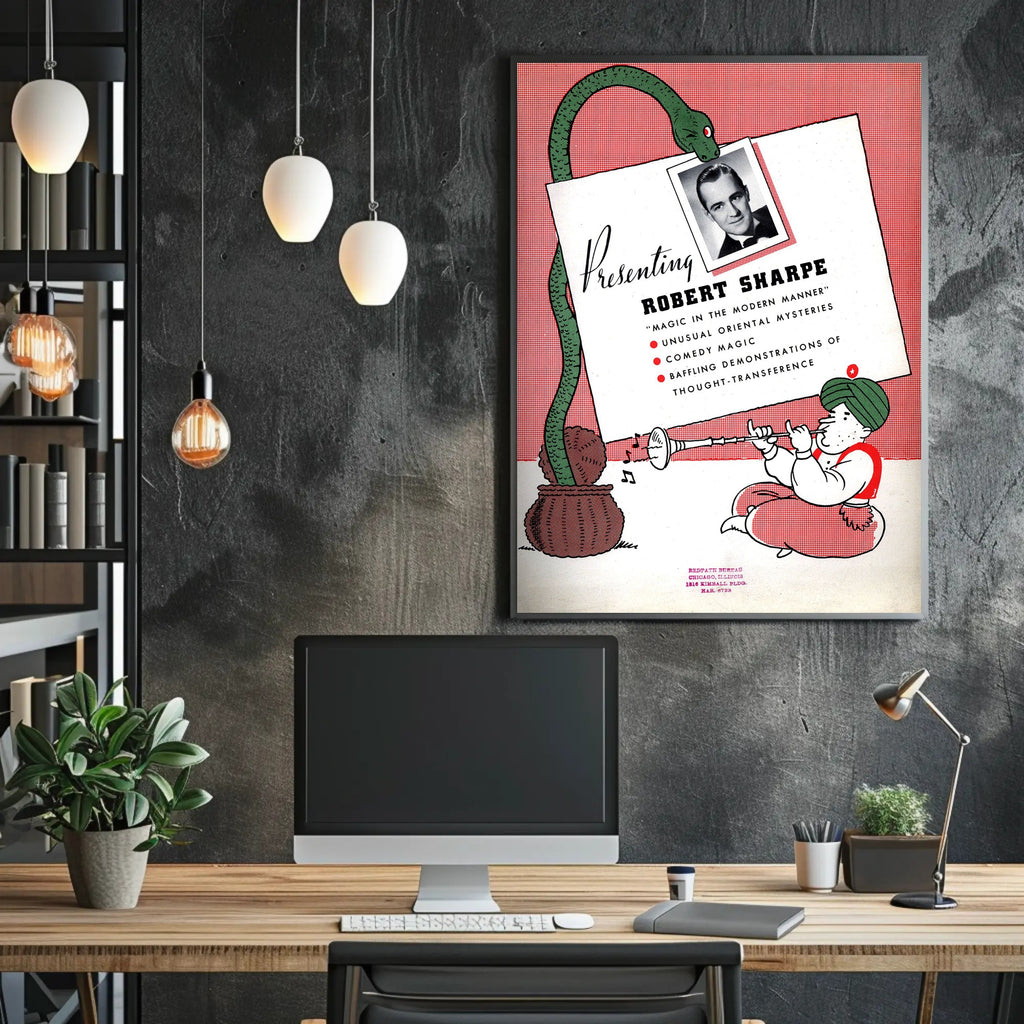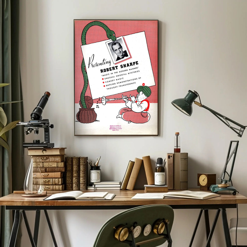 Step back into the golden age of stagecraft with the Vintage Magician Poster: Exotic Comedy Magic Show from PosterGoat — a nostalgic, theatrical piece that blends whimsical illustration with bold vintage typography. Featuring a cheeky snake rising from a woven basket, a seated piper in turbaned costume, and a clipped black-and-white performer portrait pinned to a tilted announcement card, this poster captures the playful spirit of classic comedy magic and makes an instant focal point in any room.