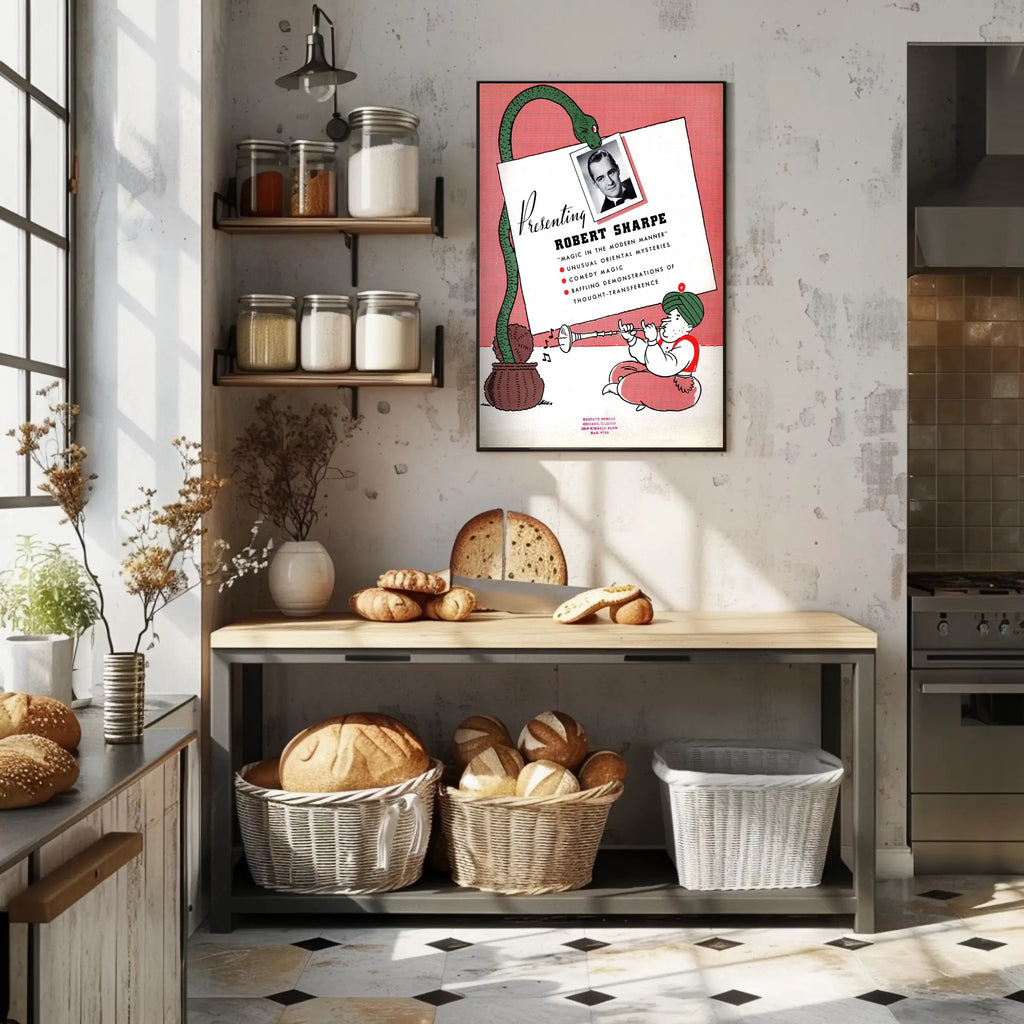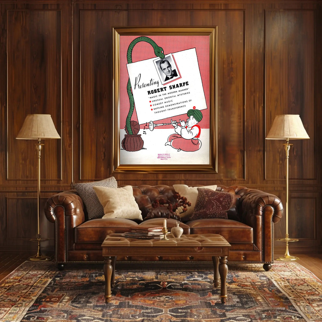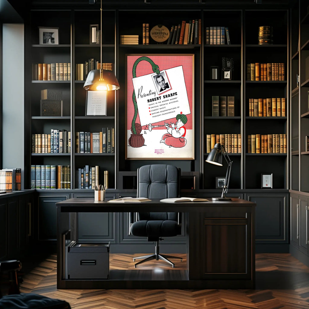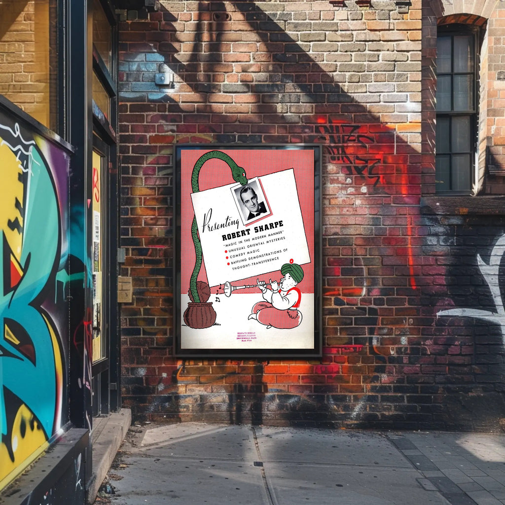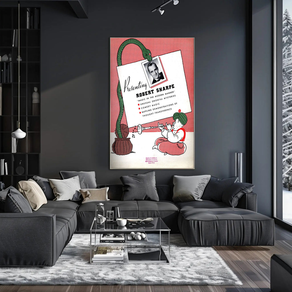 Step back into the golden age of stagecraft with the Vintage Magician Poster: Exotic Comedy Magic Show from PosterGoat — a nostalgic, theatrical piece that blends whimsical illustration with bold vintage typography. Featuring a cheeky snake rising from a woven basket, a seated piper in turbaned costume, and a clipped black-and-white performer portrait pinned to a tilted announcement card, this poster captures the playful spirit of classic comedy magic and makes an instant focal point in any room.