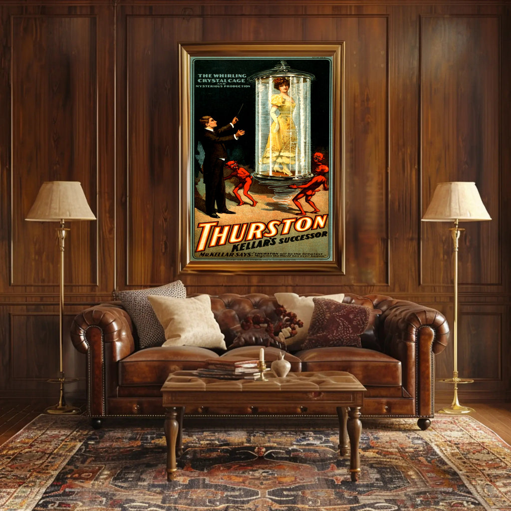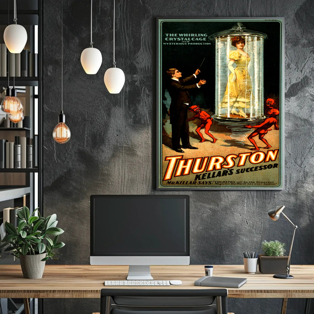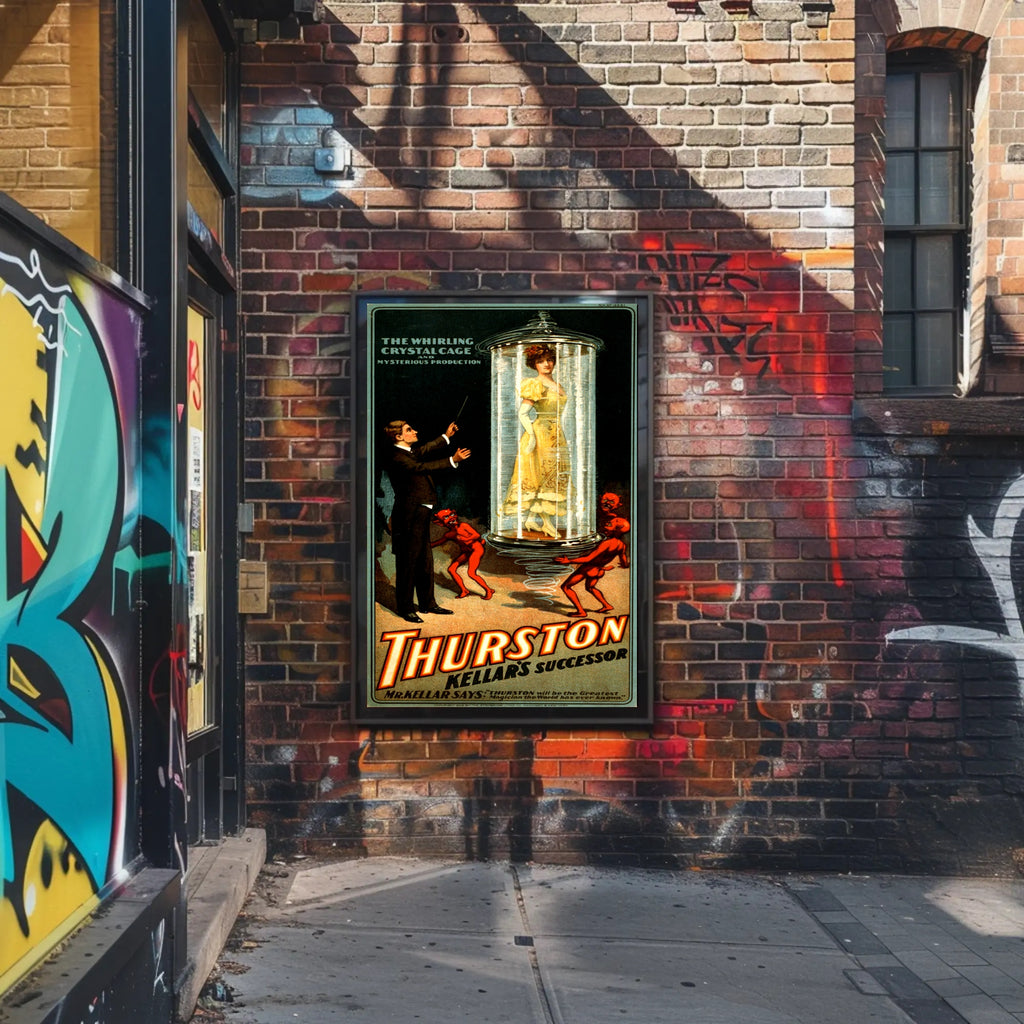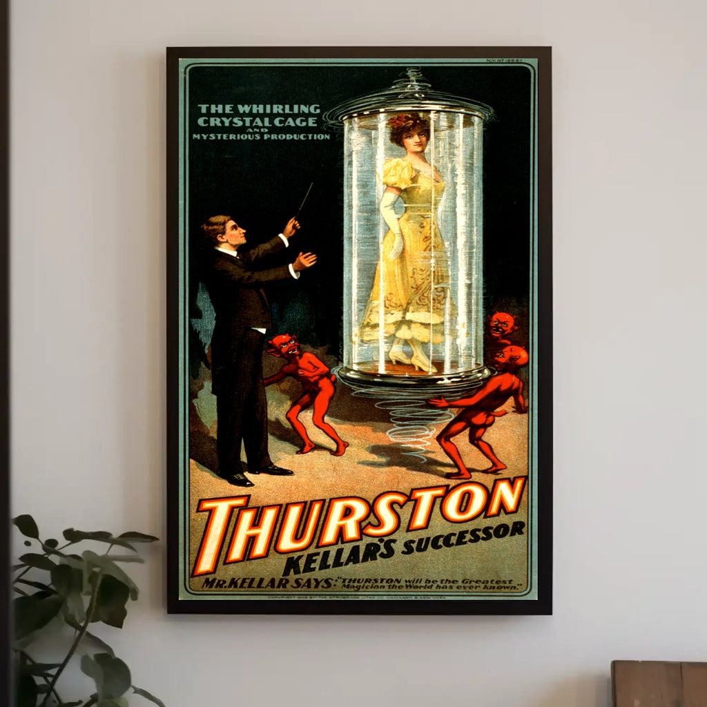 Rediscover the golden age of stage magic with this Vintage Magician's Illusion Show Early 20th Century Cultural Poster from PosterGoat. Richly illustrated and vibrantly preserved, the artwork features a dapper magician conjuring a levitating crystal cage, a graceful woman in a yellow Edwardian gown, and mischievous red imps — all framed by bold, dramatic lettering that proclaims "THURSTON." This collectible poster captures the theatrical flair and optical-illusion style of early 20th century magic advertising, making it an instant focal point for any wall.