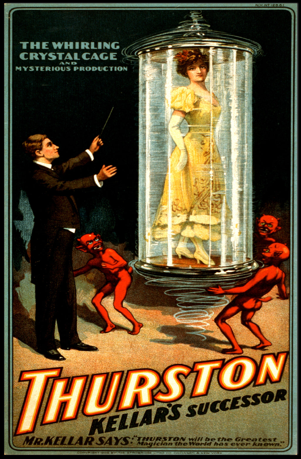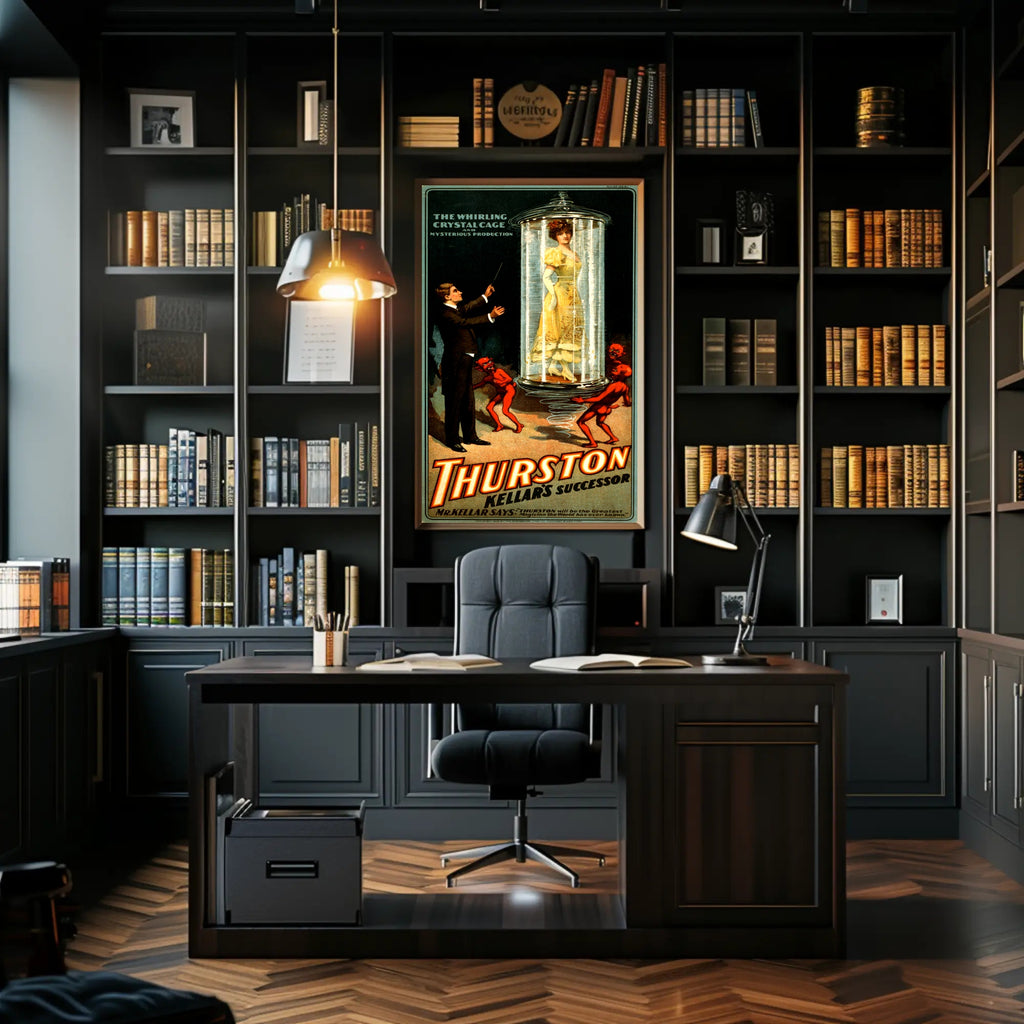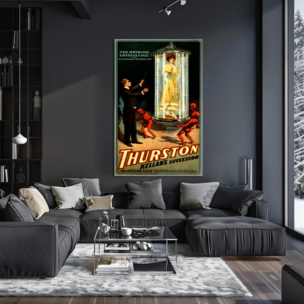 Rediscover the golden age of stage magic with this Vintage Magician's Illusion Show Early 20th Century Cultural Poster from PosterGoat. Richly illustrated and vibrantly preserved, the artwork features a dapper magician conjuring a levitating crystal cage, a graceful woman in a yellow Edwardian gown, and mischievous red imps — all framed by bold, dramatic lettering that proclaims "THURSTON." This collectible poster captures the theatrical flair and optical-illusion style of early 20th century magic advertising, making it an instant focal point for any wall.