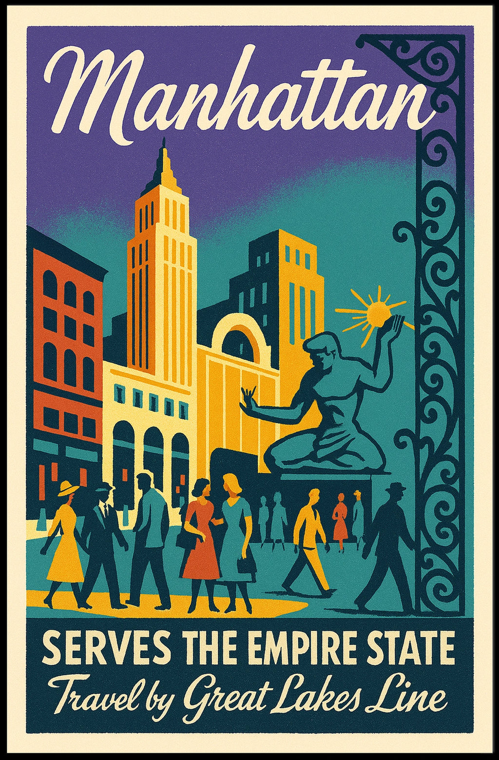 Step back in time with this Vintage Manhattan Travel Poster, a bold celebration of the mid-20th century urban spirit. The artwork captures a lively cityscape of stylized skyscrapers and elegantly dressed figures, delivering nostalgic charm with modern versatility for any wall.