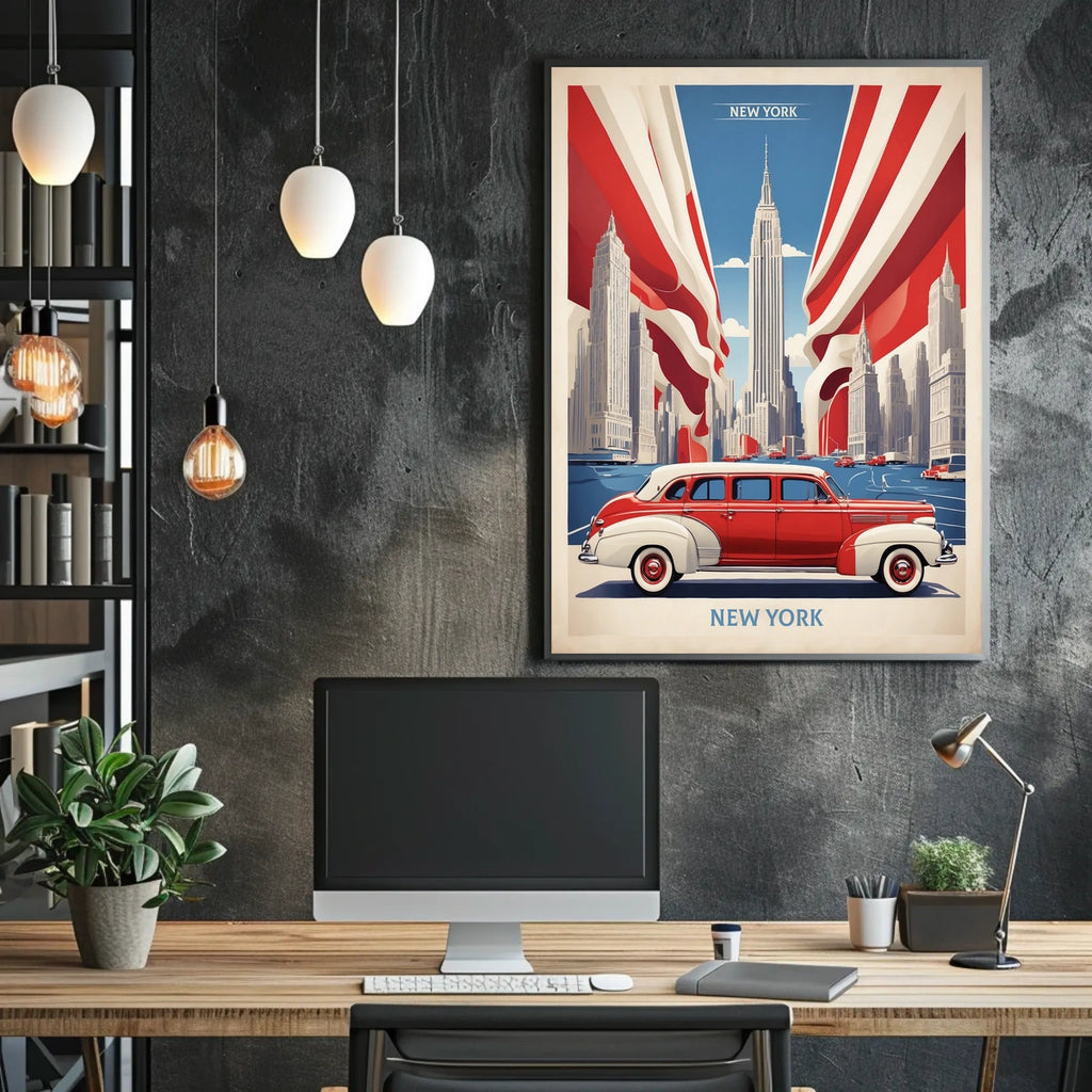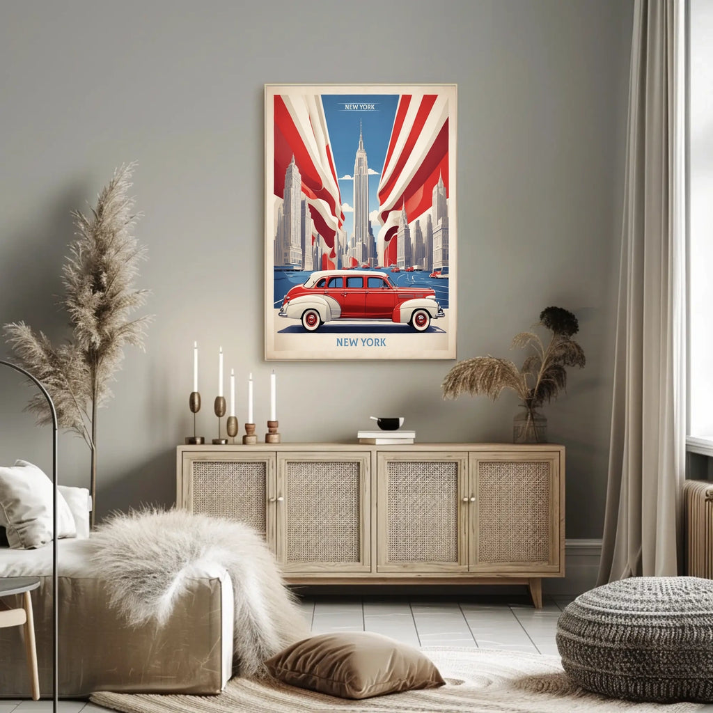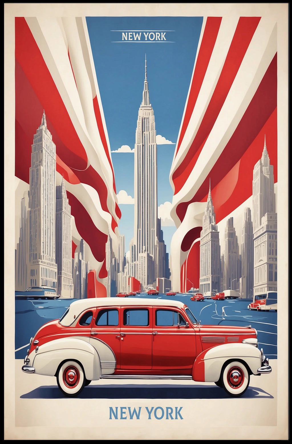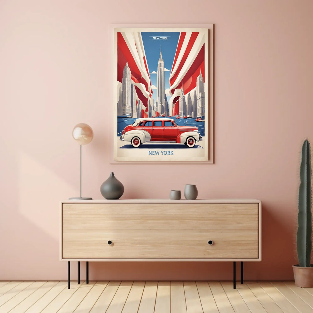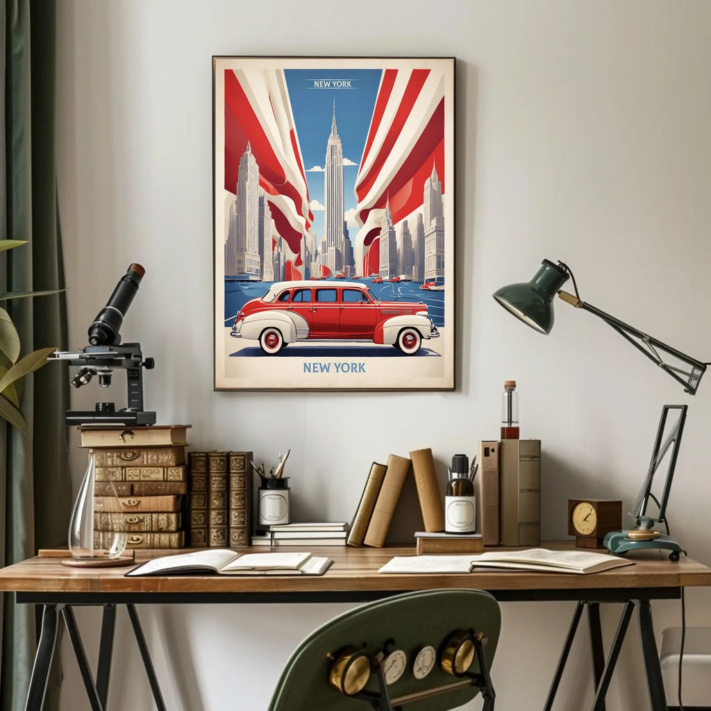 Celebrate the bustling charm of New York City with this vintage poster that blends mid-century energy with urban grandeur. A classic red-and-white car cruises beneath a skyline crowned by the Empire State Building, while flowing stripes add motion and drama. This timeless piece captures nostalgic Americana and brings city vibes into any room.