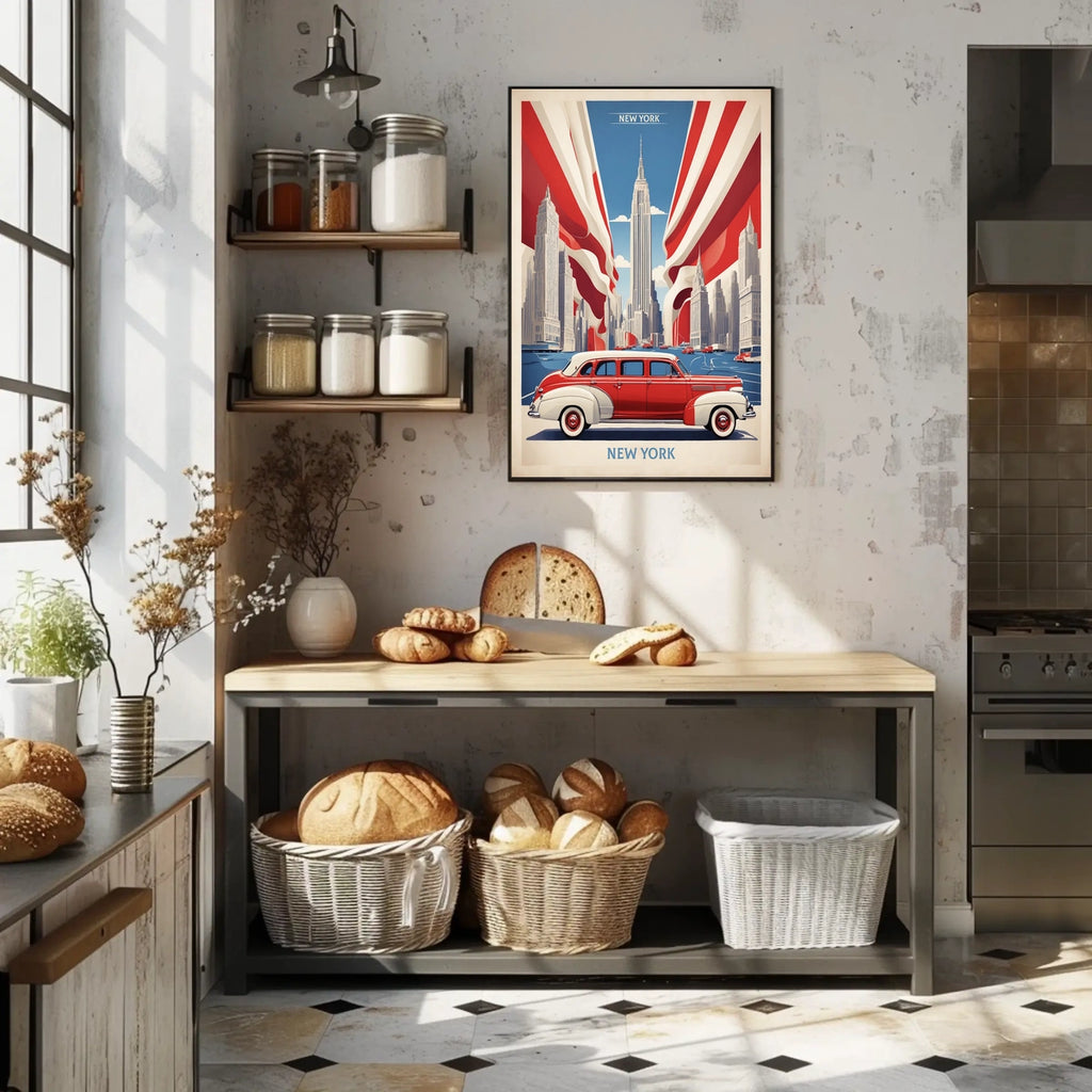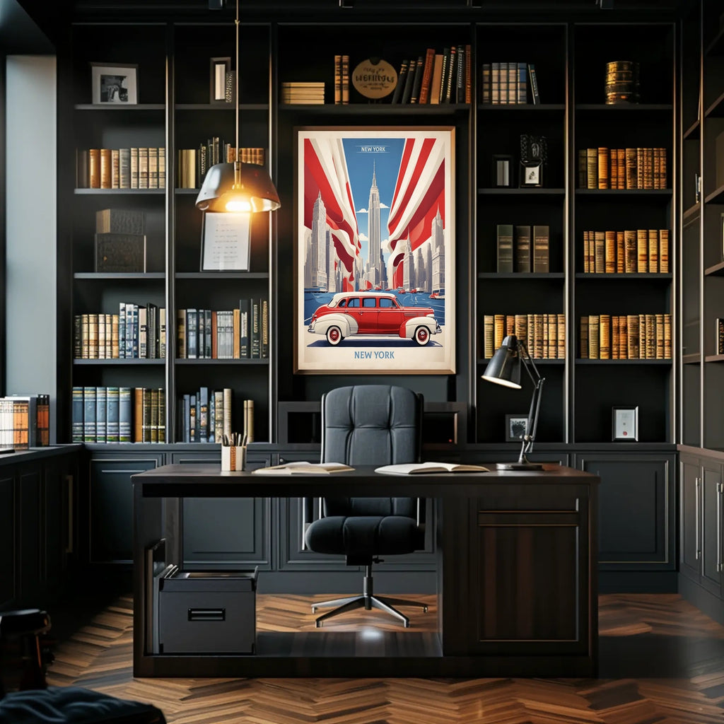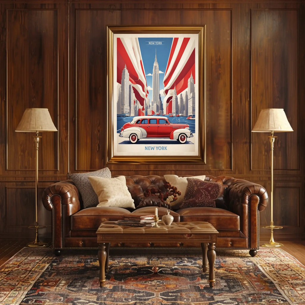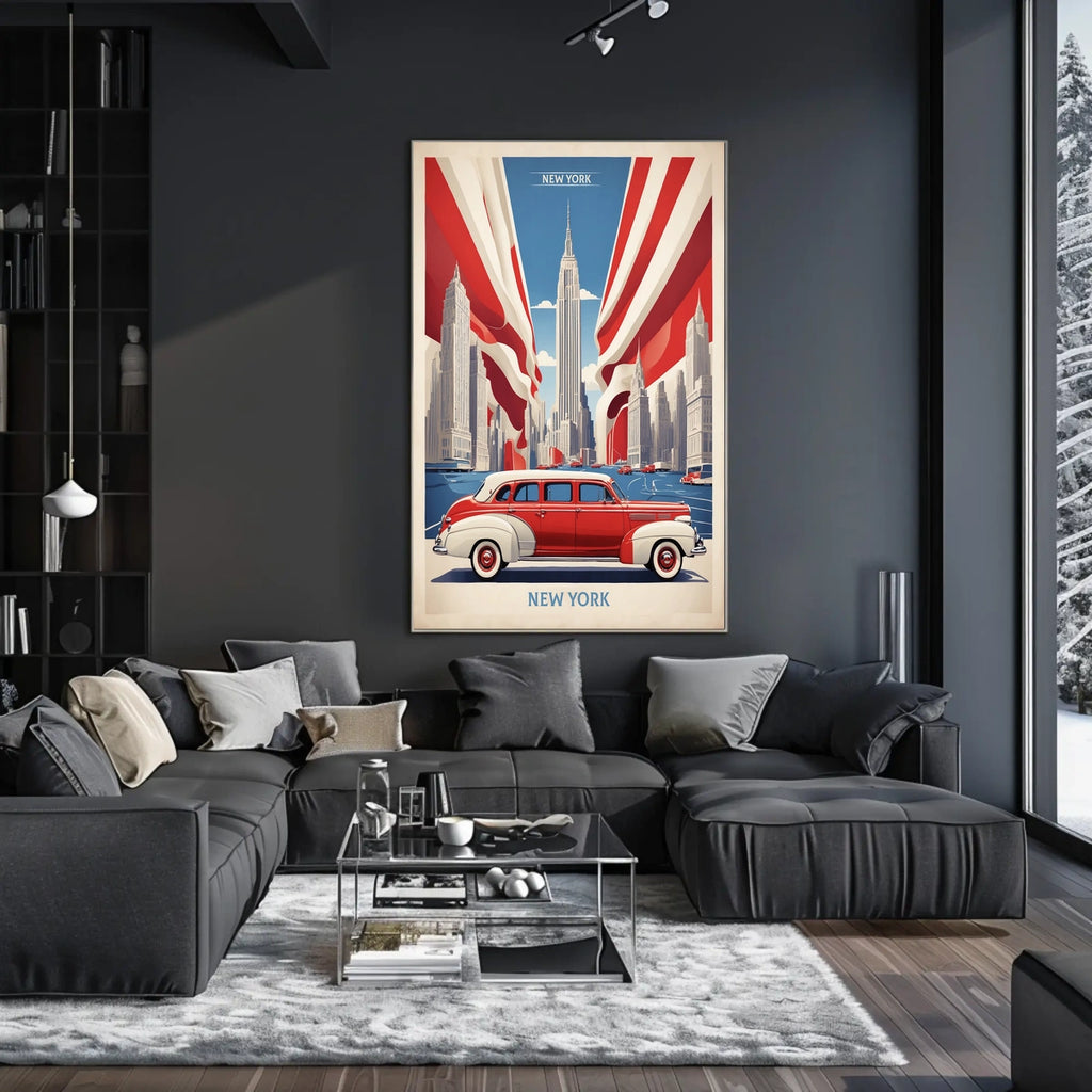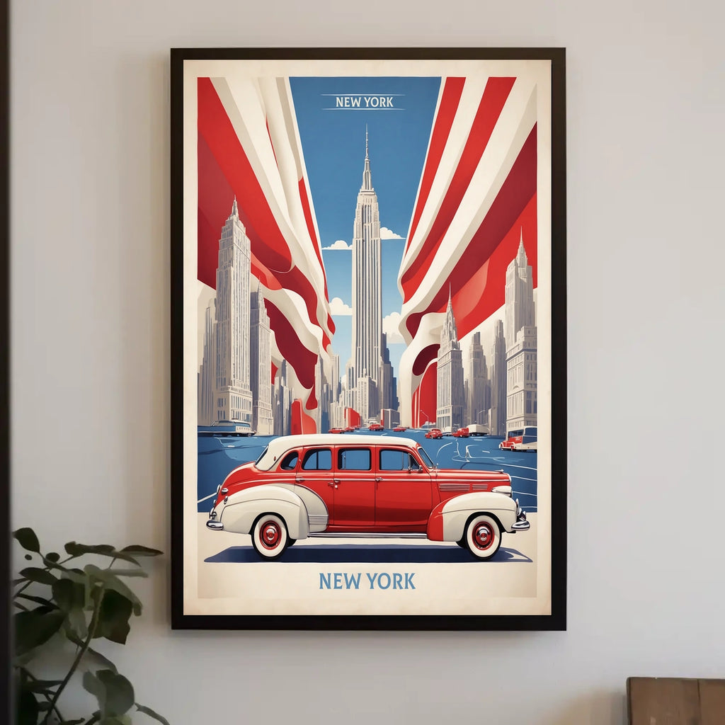 Celebrate the bustling charm of New York City with this vintage poster that blends mid-century energy with urban grandeur. A classic red-and-white car cruises beneath a skyline crowned by the Empire State Building, while flowing stripes add motion and drama. This timeless piece captures nostalgic Americana and brings city vibes into any room.