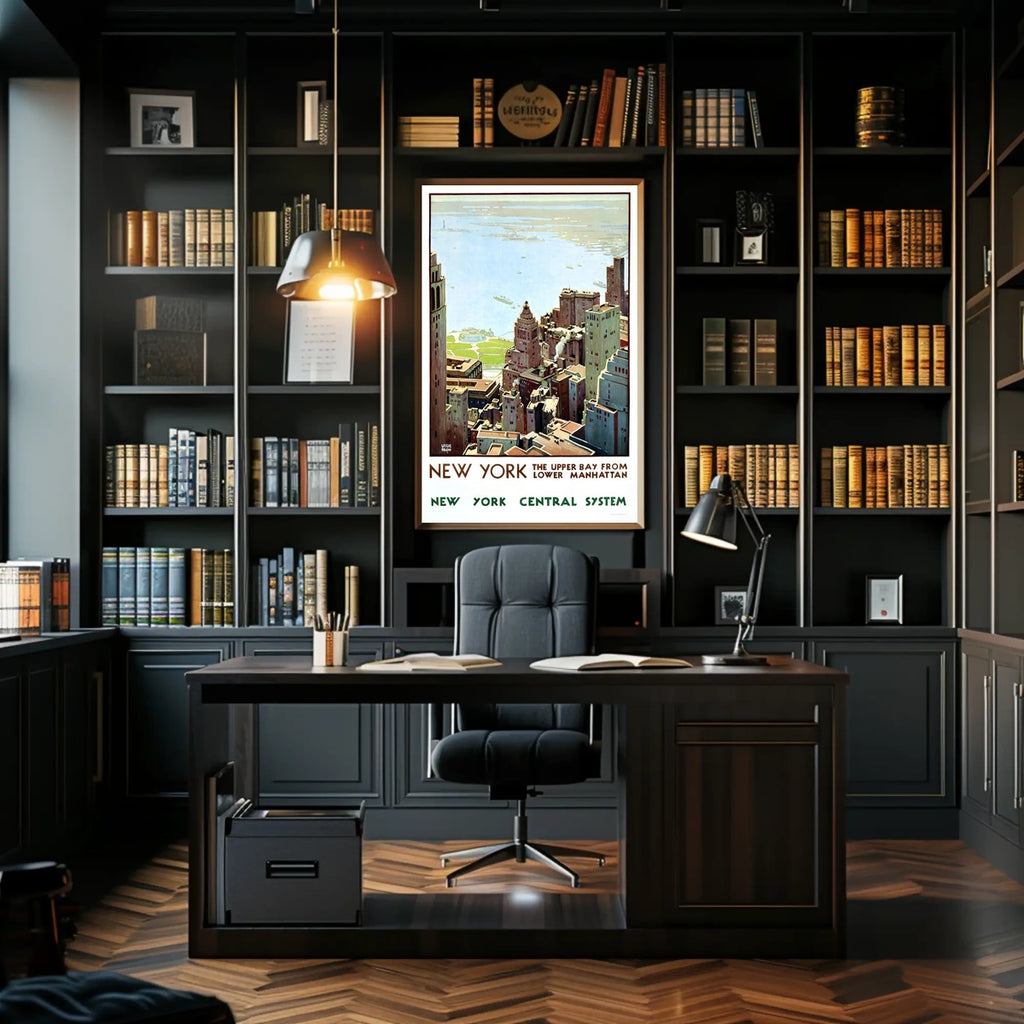 Experience timeless urban charm with this Vintage New York City Skyline Travel Poster Print. An aerial view of Lower Manhattan, this artwork blends historical art with mid-century travel poster aesthetics—creating a striking centerpiece that amplifies metropolitan allure in any room.