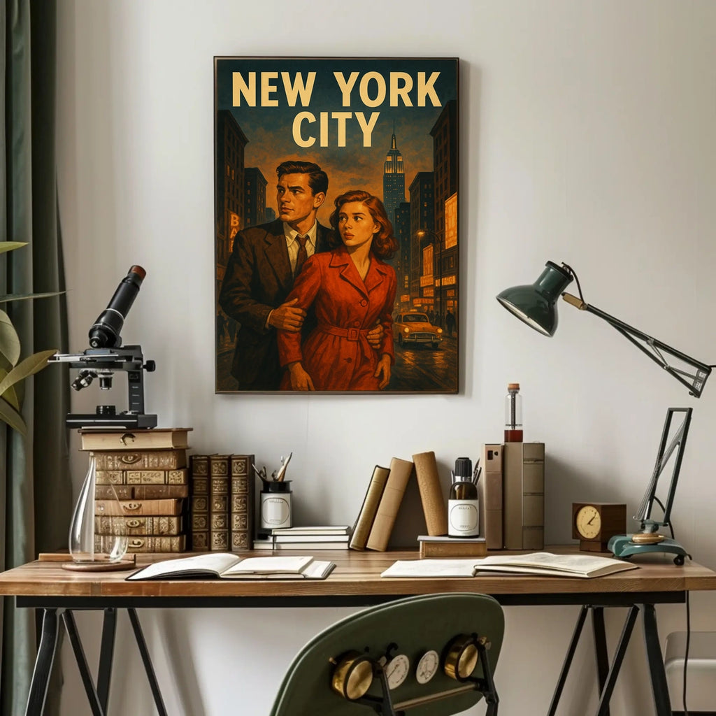 Immerse your space in mid-century mystery with this Vintage New York Noir Scene poster. Evoking classic film noir, it showcases a stylish couple wandering through a neon-lit street as a cinematic cityscape comes alive around them.