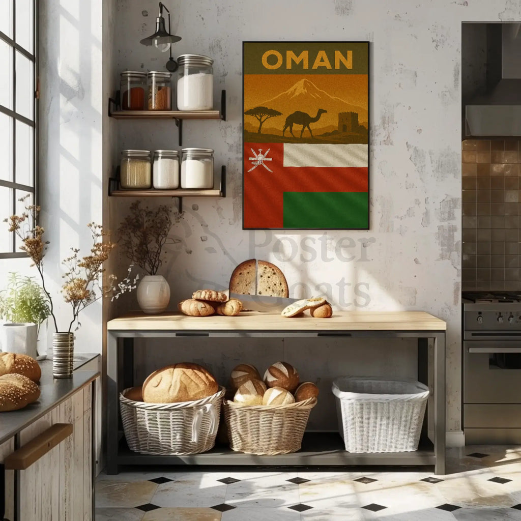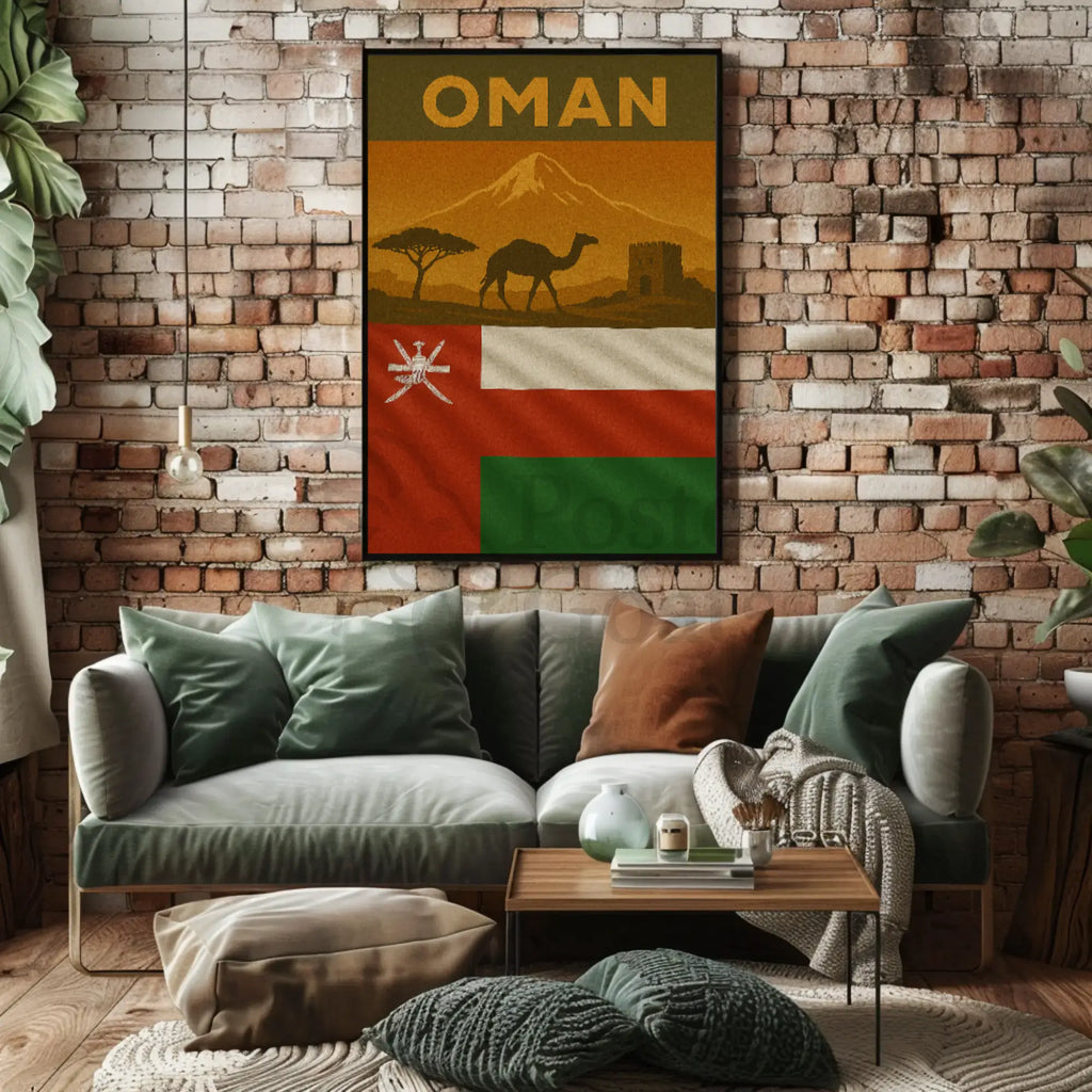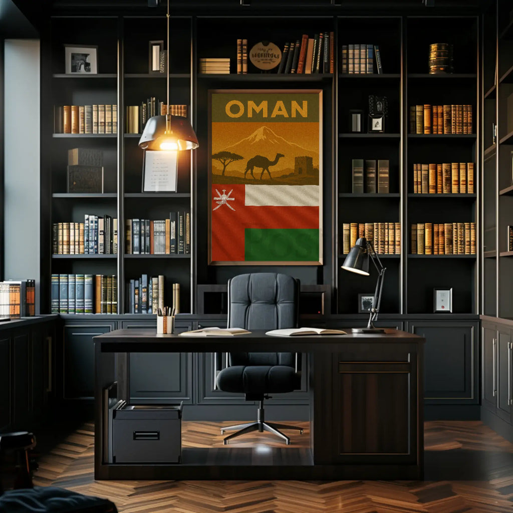 Why collectors choose this poster: Its warm palette and textured look add instant character to any room, while the cultural motifs — camel silhouette, fort, and Oman flag — make it an authentic conversation starter for travel lovers and heritage décor fans.