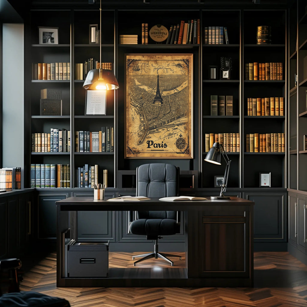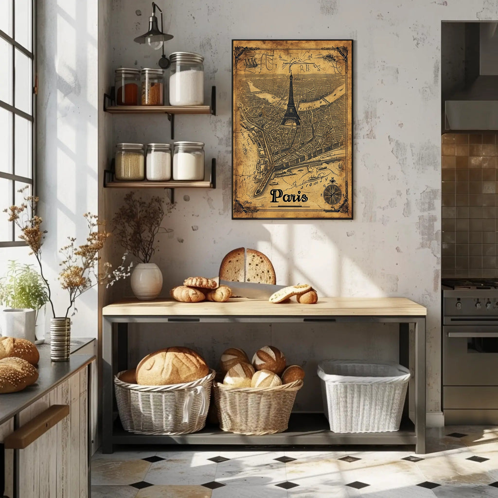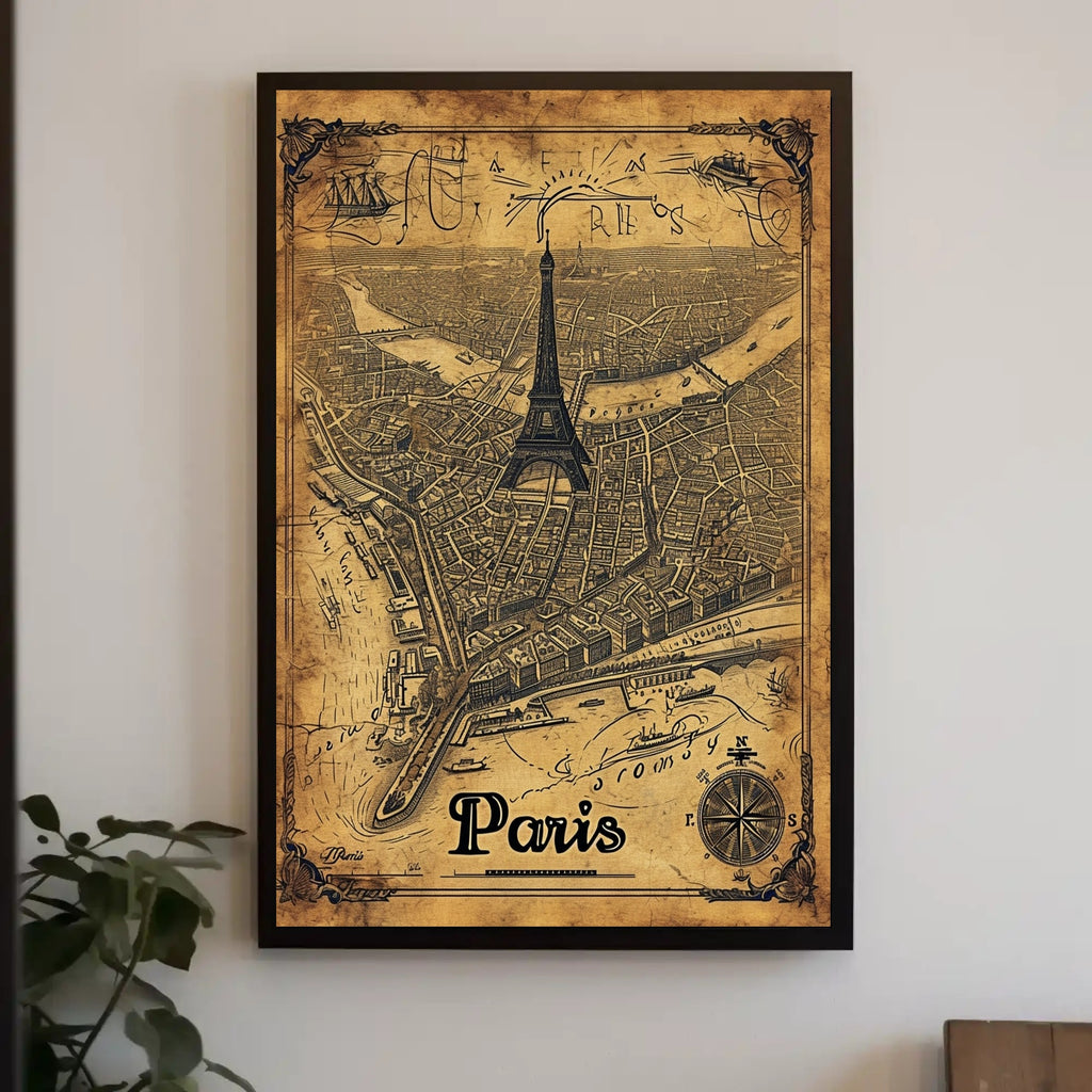 This captivating poster brings the charm of historic Paris to life with its vintage-style map design. Intricate old-world illustrations capture the essence of the City of Light, prominently featuring the iconic Eiffel Tower at its heart. The sepia-toned color palette adds an antique, nostalgic feel, perfect for evoking a sense of exploration and romance. Nautical elements like compasses and ships enhance the poster's historical aesthetic, making it an ideal decoration for those who appreciate travel, history, and French culture. An exquisite piece for any room, offering elegance and a touch of Parisian allure.