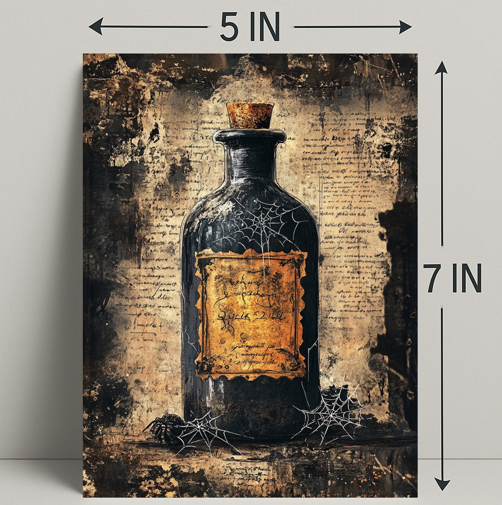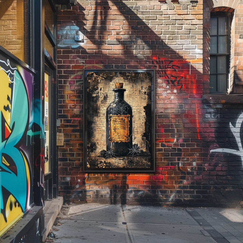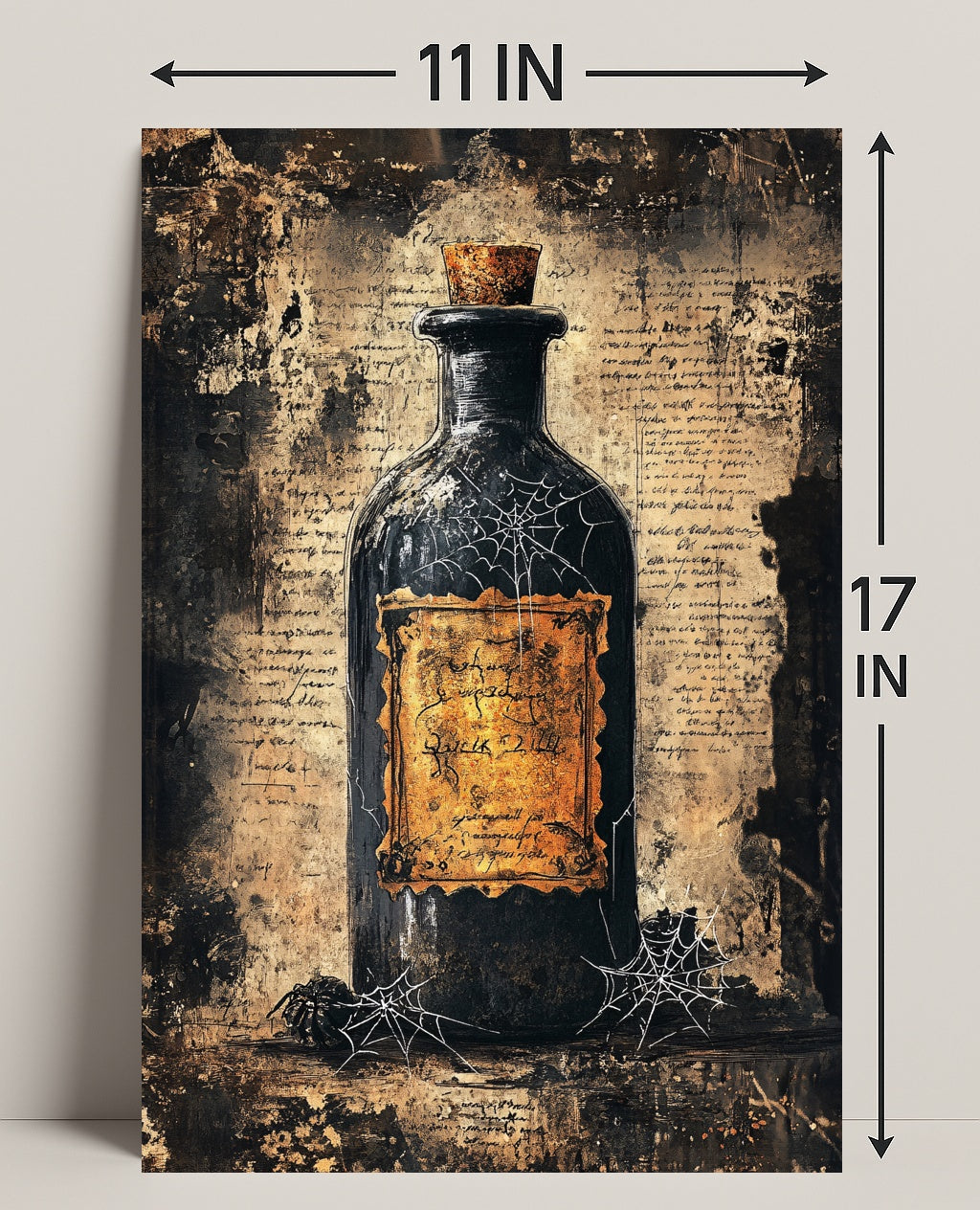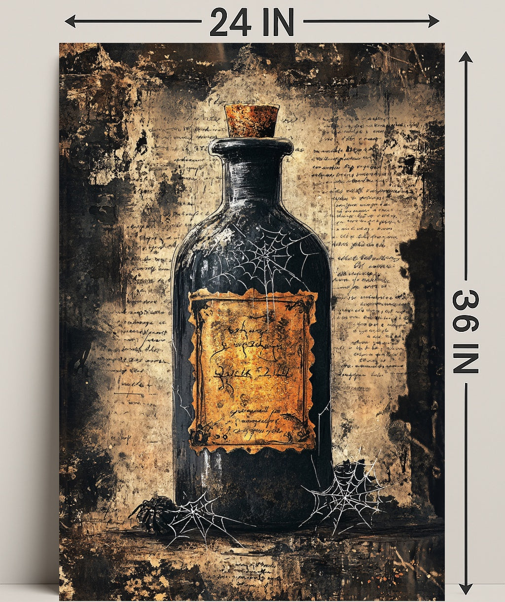 Add a touch of mysterious vintage charm to your walls with the Vintage Potion Bottle Vintage Poster from PosterGoat. This evocative poster features a tall, aged glass bottle sealed with a cork, a weathered gold label, and delicate spiderweb accents set against a textured, sepia-toned backdrop — a perfect statement piece for fans of vintage, potion-inspired, or Halloween-themed wall art.