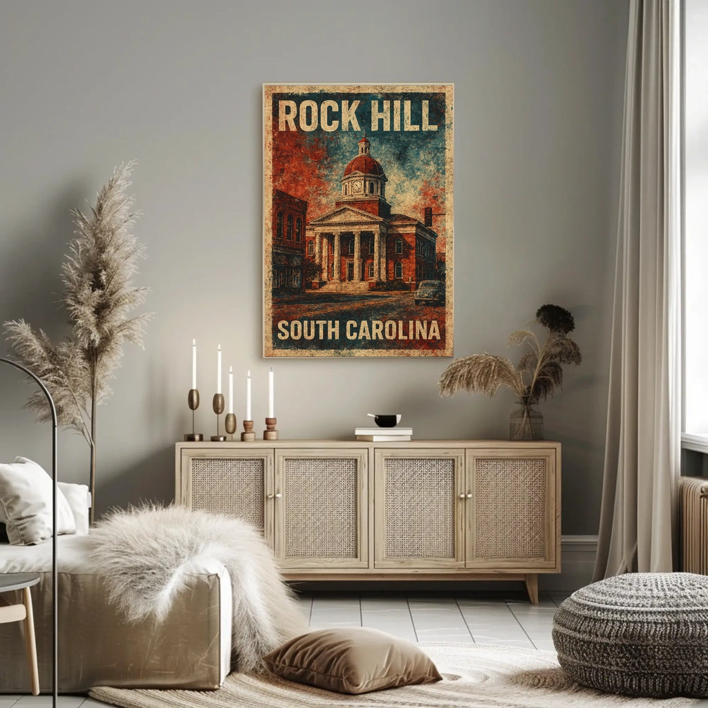 Celebrate the beauty of Vintage Rock Hill Architecture Poster - Urban or Cityscape Poster with this timeless wall art. Discover the charm of Rock Hill, South Carolina, with this vintage-inspired artwork capturing the historical elegance of a neoclassical building adorned with a red dome and clock tower. This piece prominently highlights a possible historic courthouse, surrounded by early to mid-20th century architecture, delivering a nostalgic experience that evokes Americana. The textured, distressed style and the palette of earthy reds and blues create a historical and patriotic ambiance. Perfect for history enthusiasts or those seeking to add cultural depth to their space, this poster celebrates the classic American town spirit.