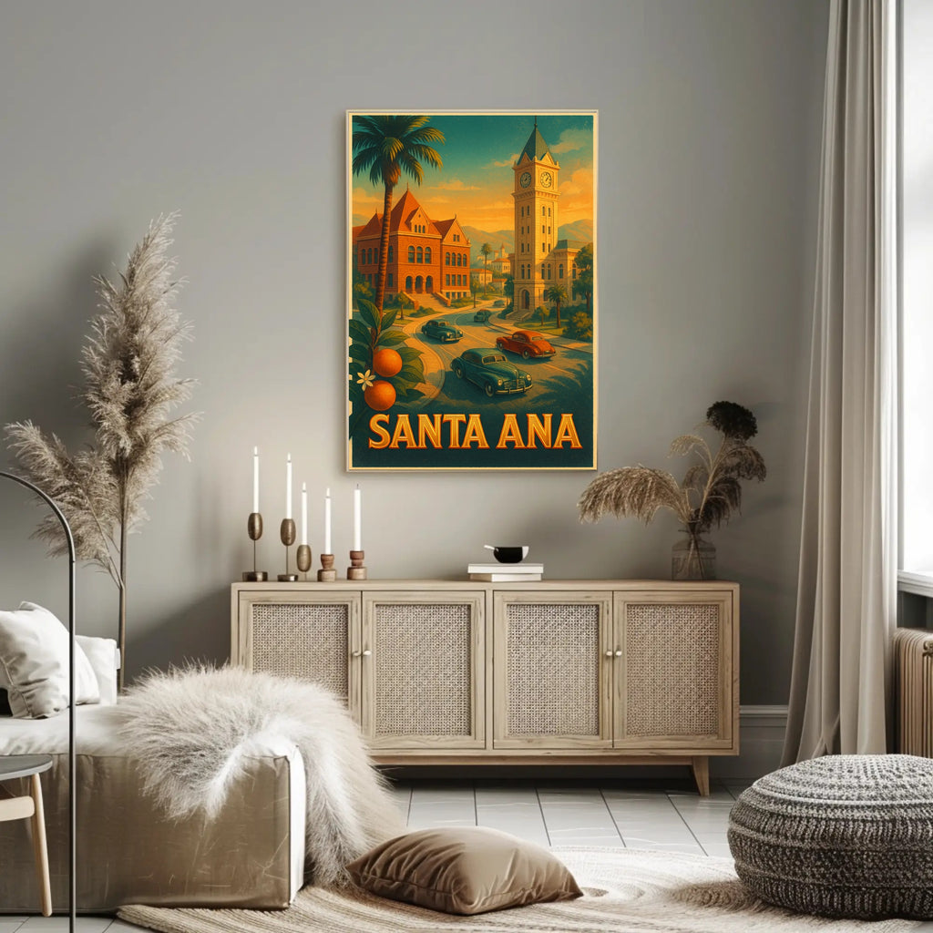 Vintage Santa Ana Travel Poster from PosterGoat captures a sunlit mid-century moment when classic cars cruised tree-lined streets beneath tall palm fronds and a stately clock tower watched over the town. Rendered in warm oranges, deep teal skies and golden highlights, this 18x24 poster evokes California nostalgia and timeless travel charm—perfect for bringing vintage flair to any room.