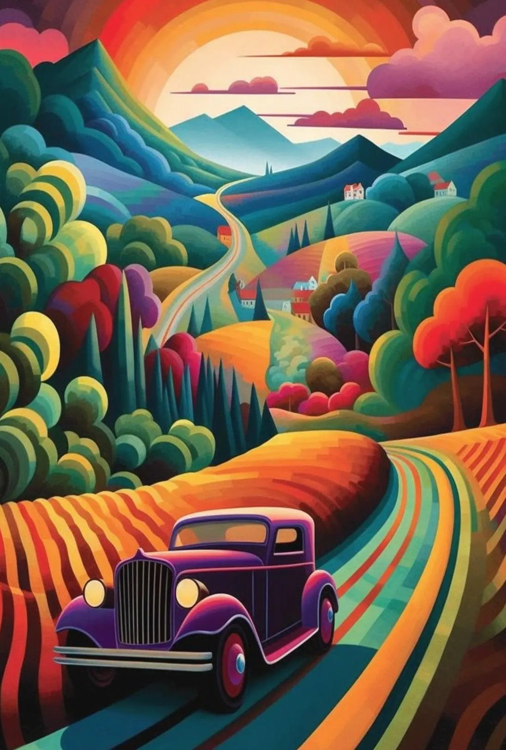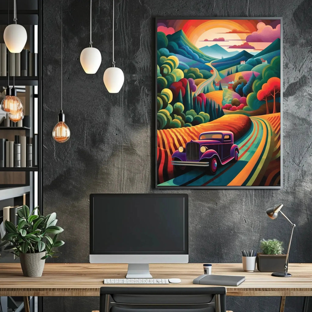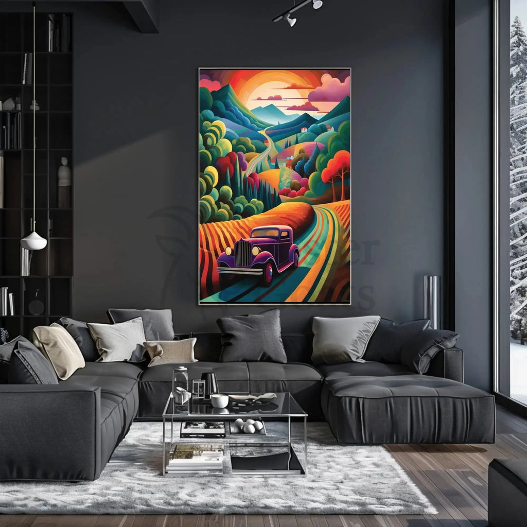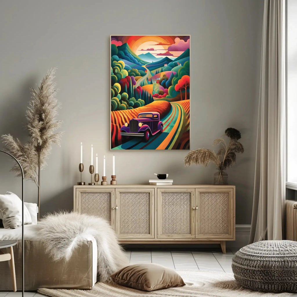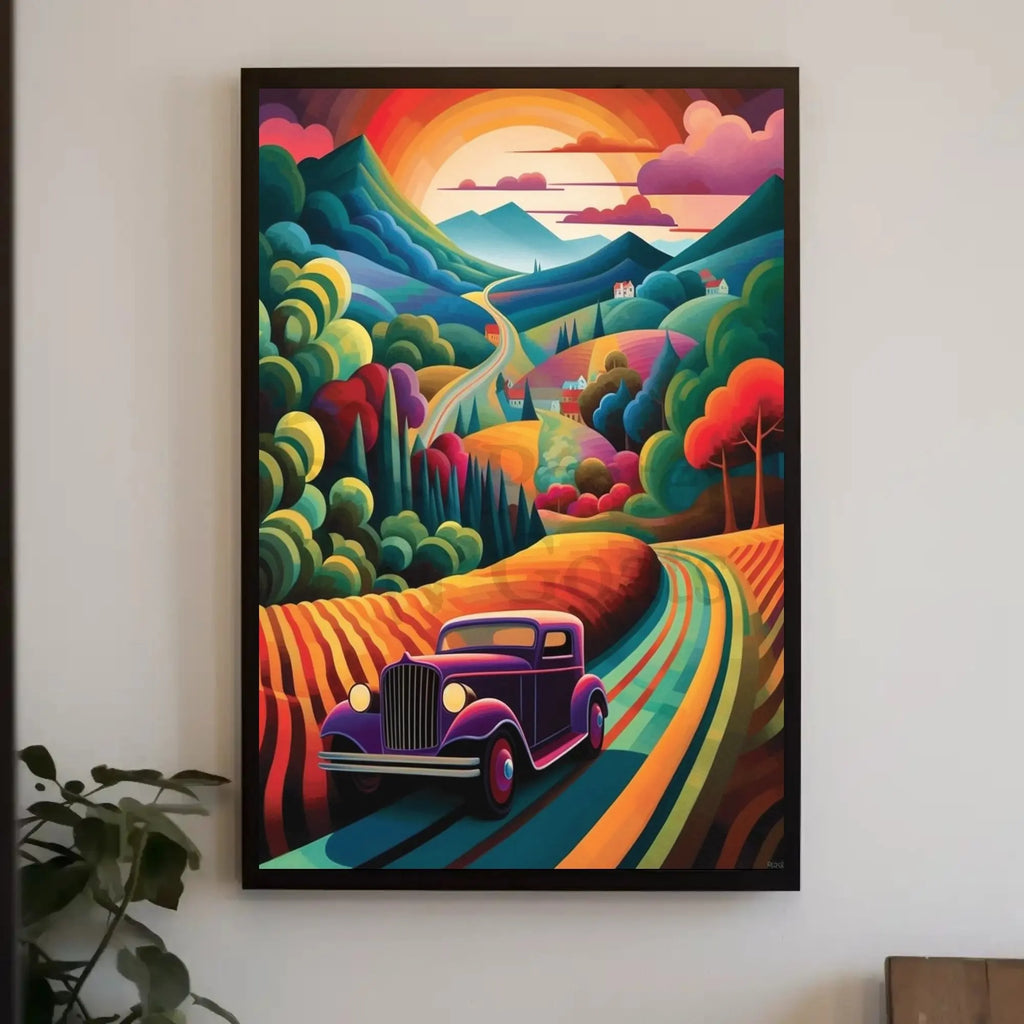 Bring the romance of the open road into your home with the Vintage Scenic Road Adventure Travel Poster from PosterGoat. This striking poster blends retro travel nostalgia with a modern vaporwave/synthwave color palette—showcasing a stylized countryside, rolling hills, a winding road and a classic vintage car beneath a radiant sunset. The result is a bold, collectible print that transforms any wall into an invitation to explore.