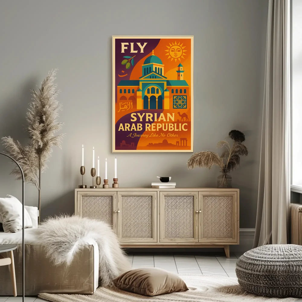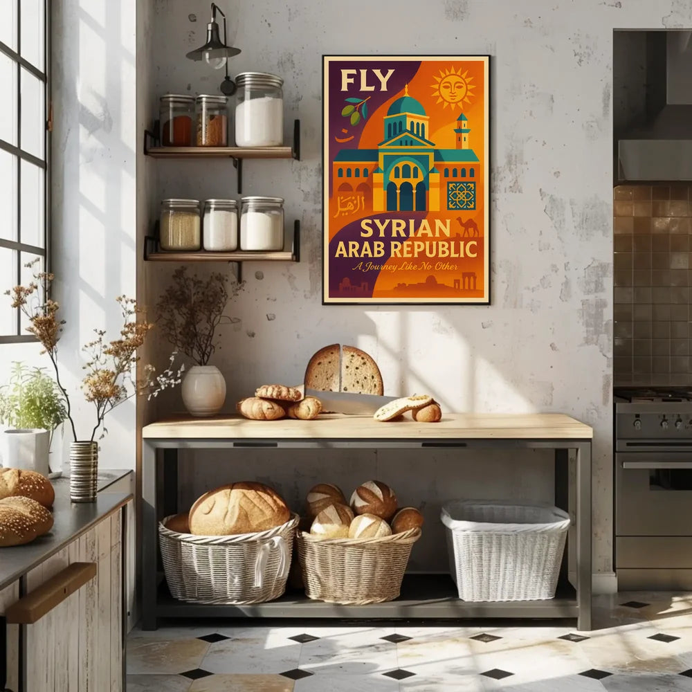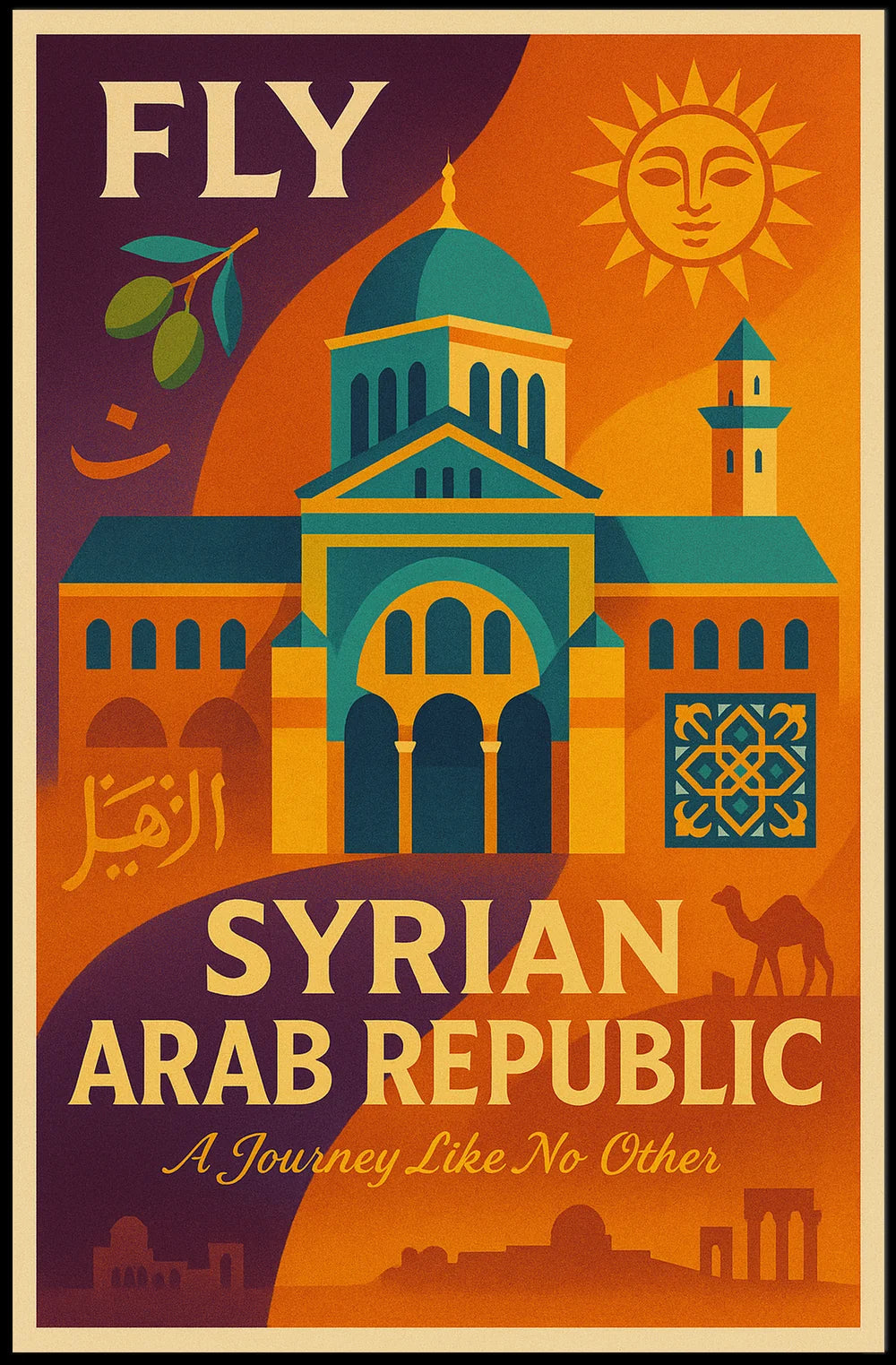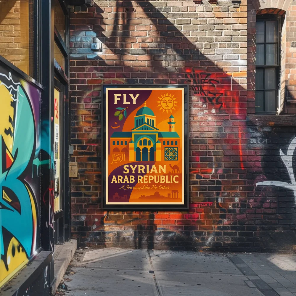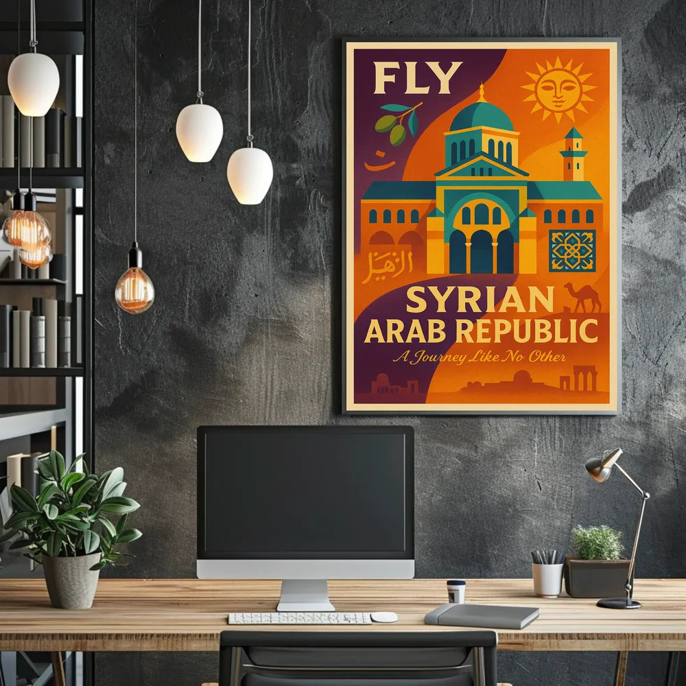 Embark on a nostalgic journey through time with this vintage-inspired Syrian travel poster. Aptly capturing the allure of Middle Eastern architecture, it features elements like domes and arches, reminiscent of historic significance. The design includes vibrant symbols: a serene sun with a face, olive branches symbolizing peace, and a majestic camel silhouette evoking adventure. Rich with Arabic calligraphy and Islamic geometric patterns, the poster's warm oranges, teals, and golds create an inviting, exotic atmosphere. Perfect for those who cherish cultural explorations and classic travel art, this piece makes Syria's enchanting past come alive.