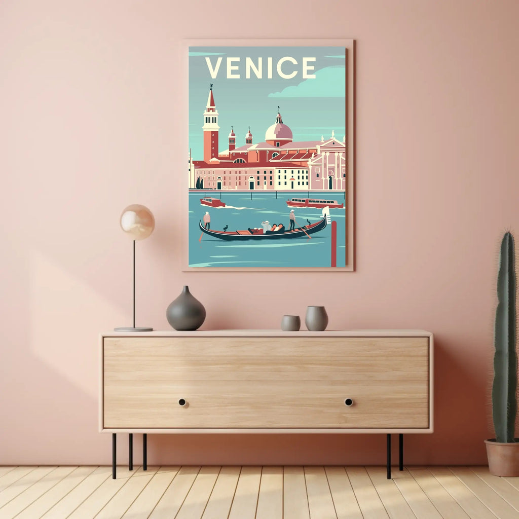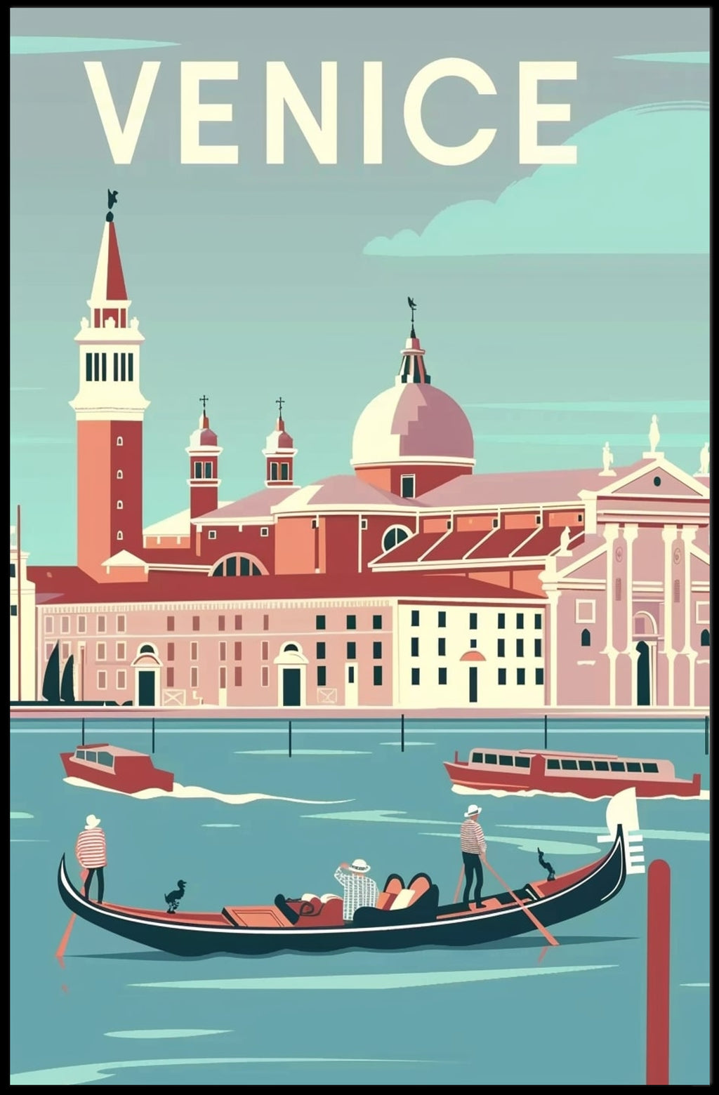 Vintage Venice Gondola Travel Poster from PosterGoat brings the timeless romance of Venetian canals into your home with a mid-century travel-poster aesthetic. Soft pastel hues, clean minimalist lines, and a nostalgic synthwave vibe capture a serene gondola gliding past historic Venetian architecture — an elegant statement piece for any wall.