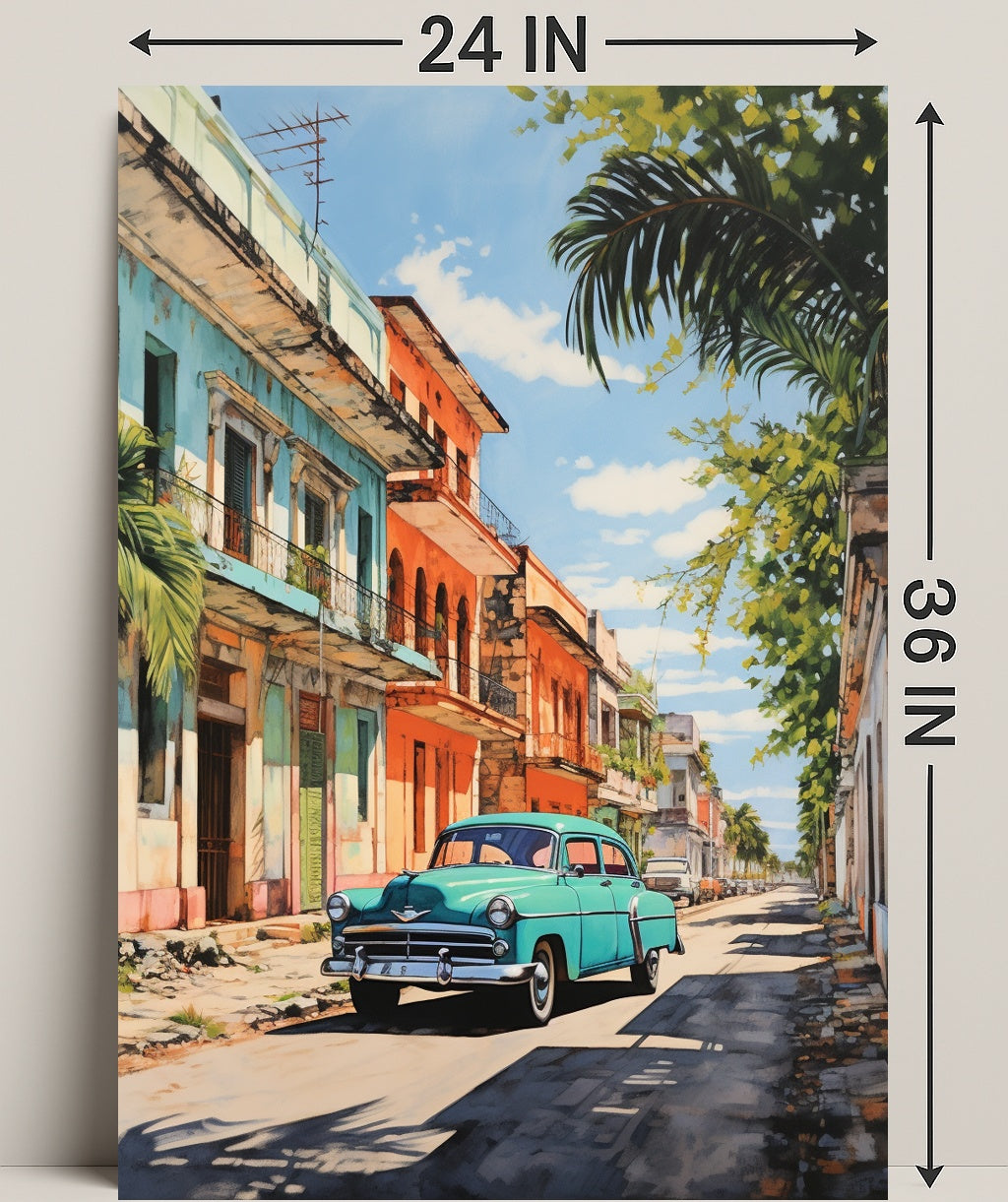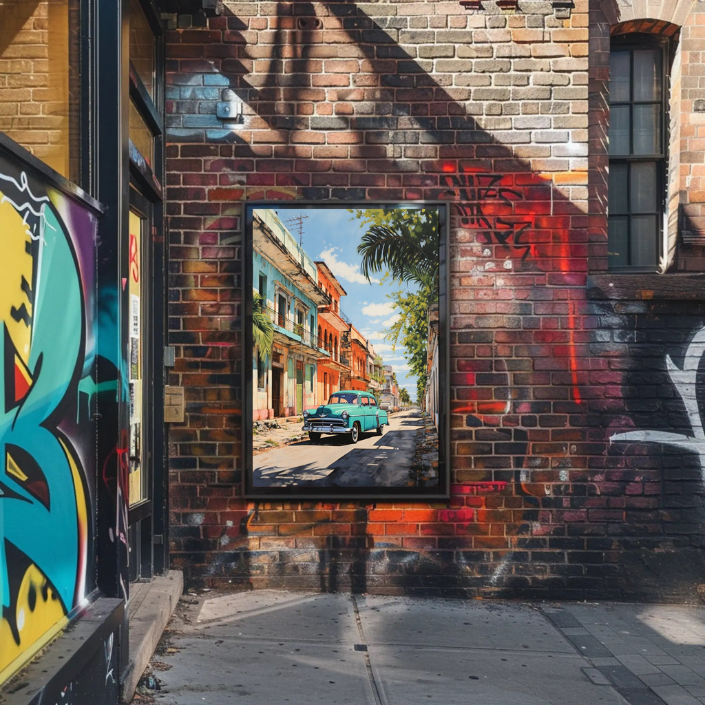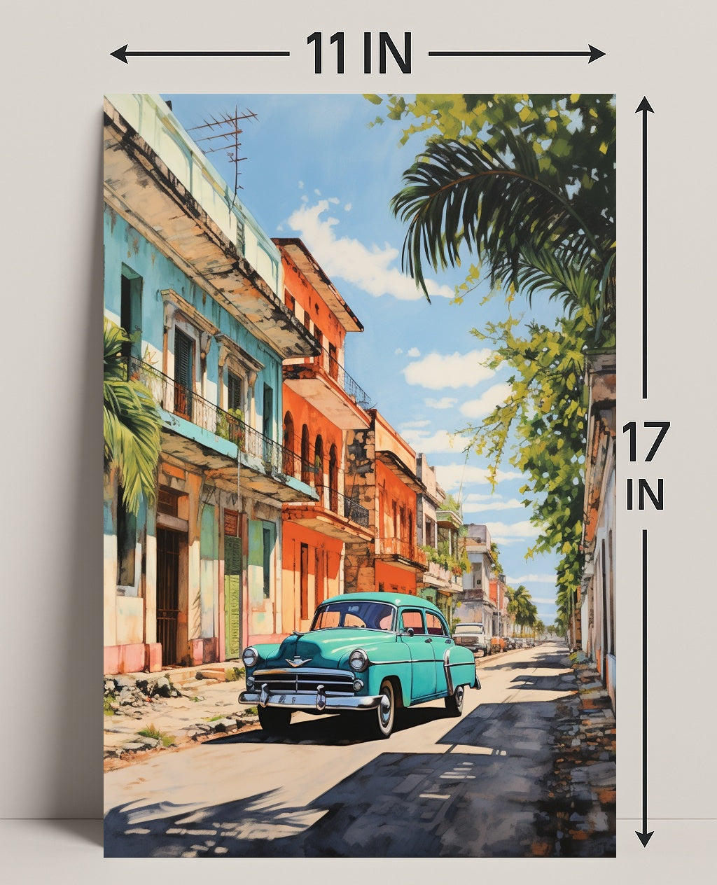 Bring a sun-drenched escape into your home with the Vintage Vibes On A Sunny Street Vintage Poster from PosterGoat. This evocative print captures a classic turquoise car cruising down a palm-lined street framed by weathered pastel facades, bright blue skies, and crisp, energetic shadows — a perfect blend of travel-inspired nostalgia and minimalist wall art.