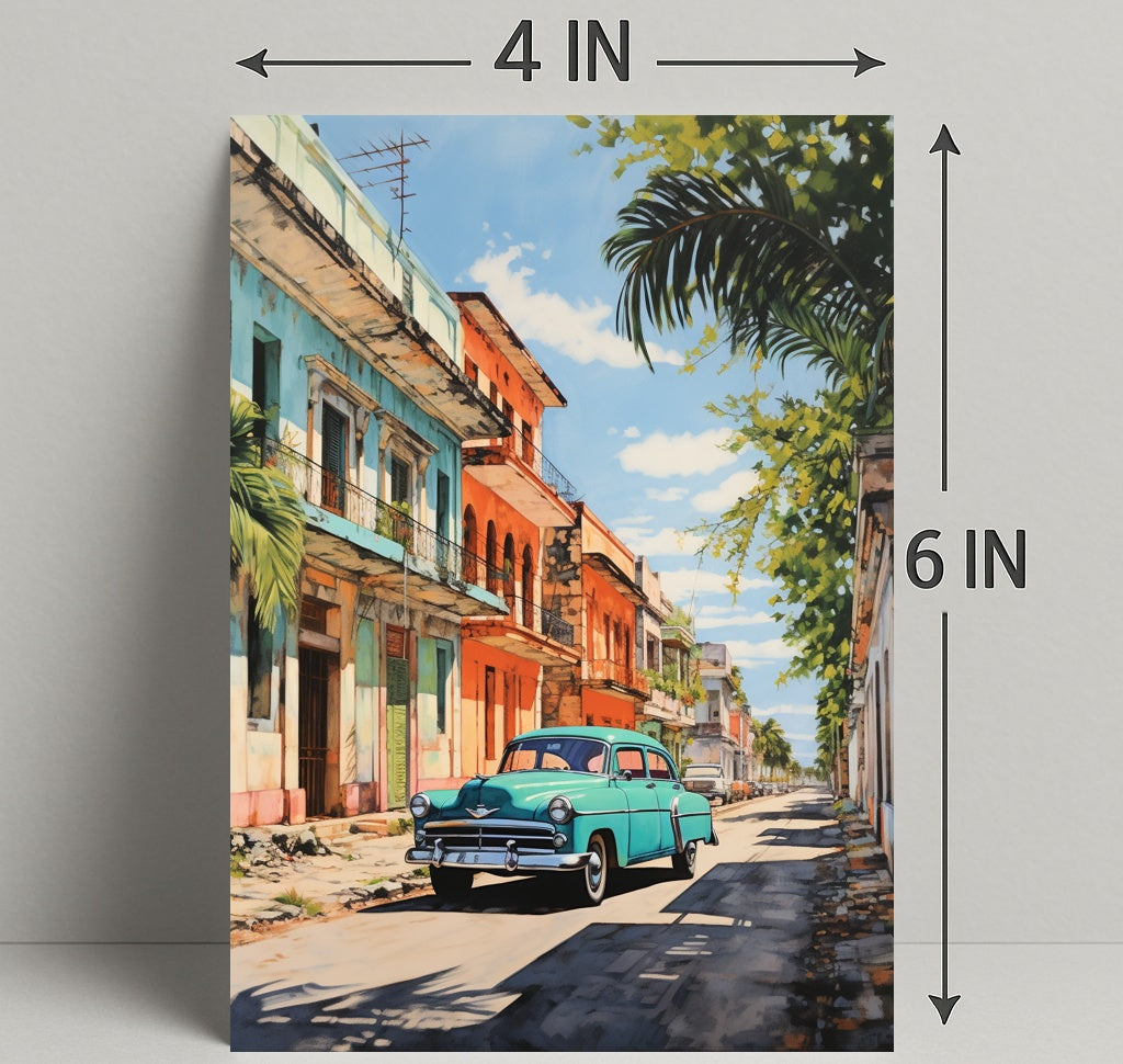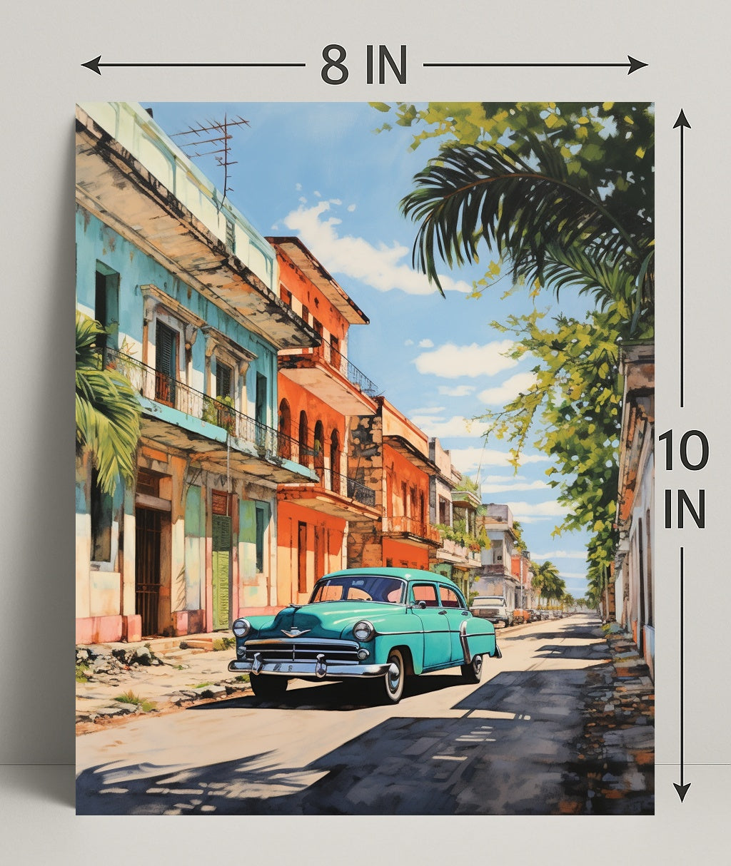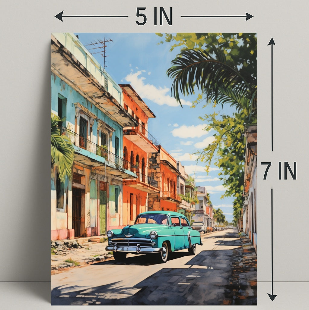 Bring a sun-drenched escape into your home with the Vintage Vibes On A Sunny Street Vintage Poster from PosterGoat. This evocative print captures a classic turquoise car cruising down a palm-lined street framed by weathered pastel facades, bright blue skies, and crisp, energetic shadows — a perfect blend of travel-inspired nostalgia and minimalist wall art.