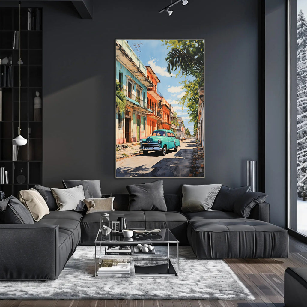 Striking imagery: A retro car in vivid turquoise set against sunlit, textured buildings creates an instant focal point for any room.