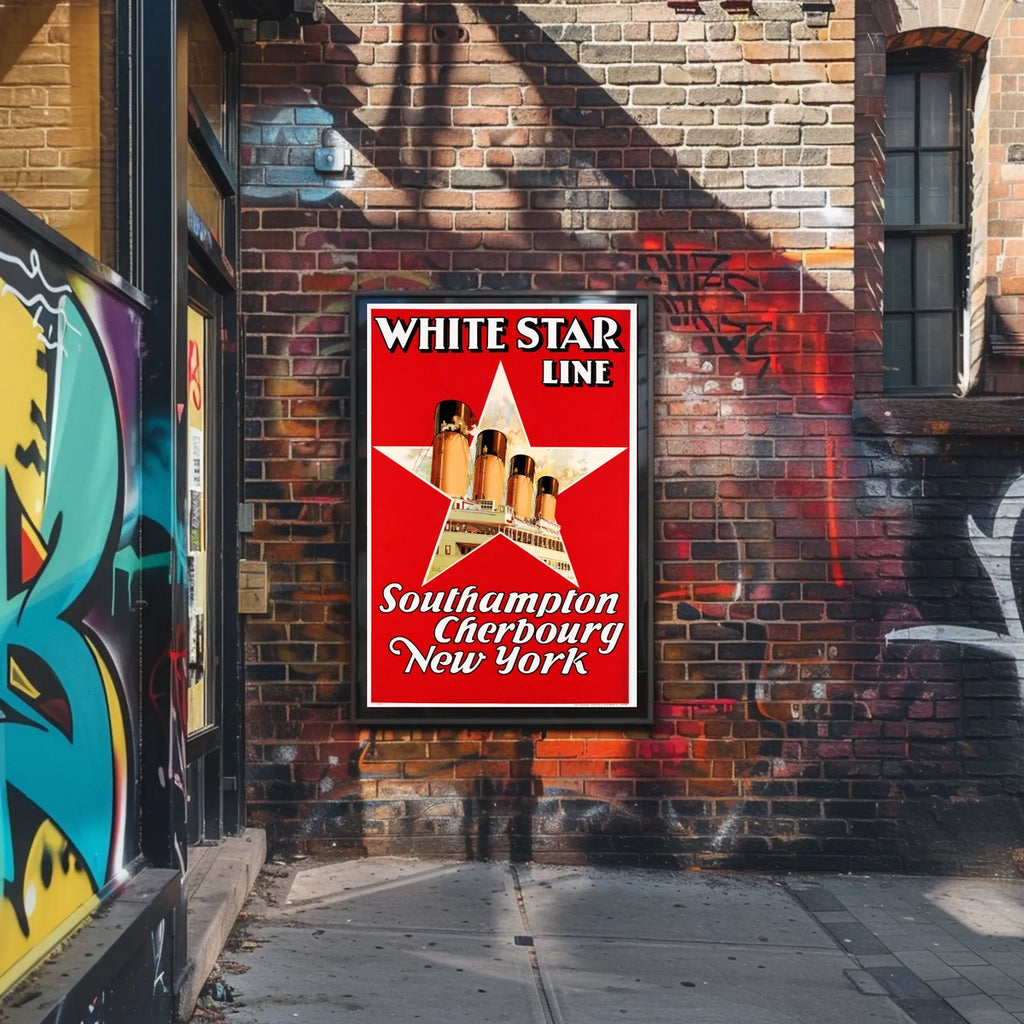 Step back in time with a photorealistic poster featuring a majestic early 20th-century White Star Line ocean liner. The bold red canvas is anchored by a large white star, delivering instant maritime drama and nostalgic luxury for any wall.