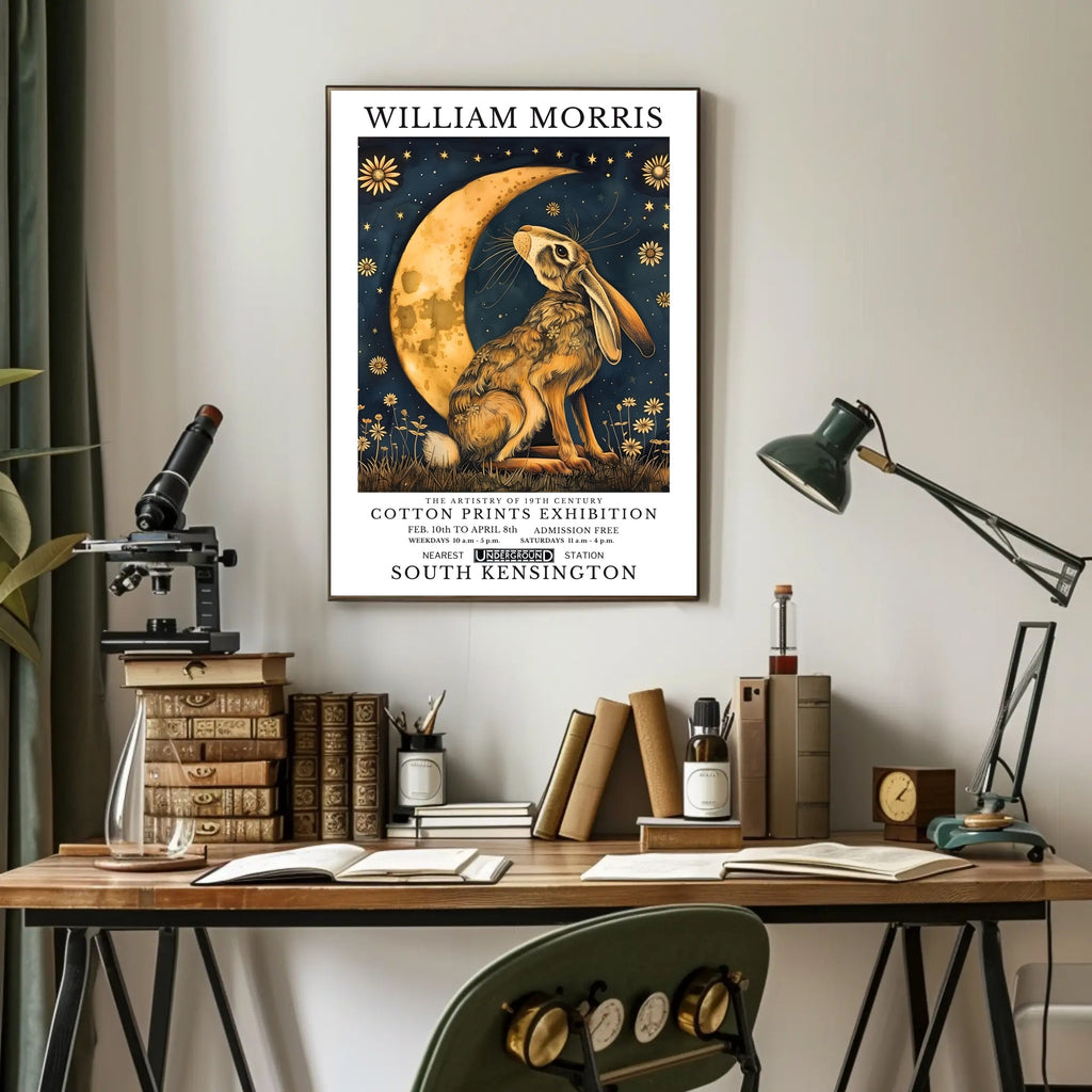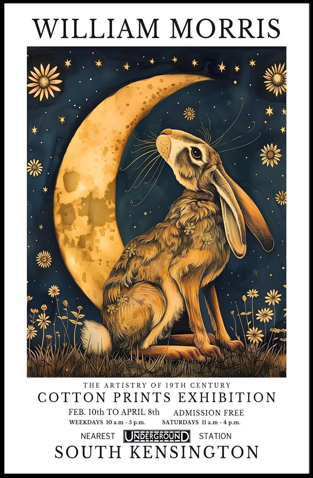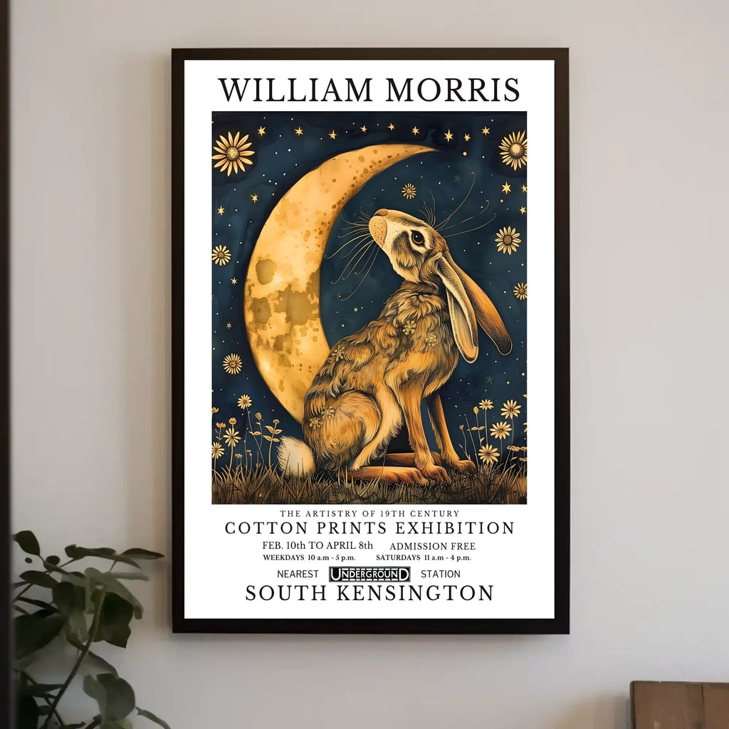 Vintage William Morris Hare Moon Artistic Poster by PosterGoat brings together 19th century charm and whimsical nature imagery for a stunning focal point in any room. This artful poster features a finely detailed hare gazing upward at a luminous crescent moon, set against a deep navy star-speckled sky and surrounded by delicate floral motifs—an evocative blend of historical art and modern wall décor.