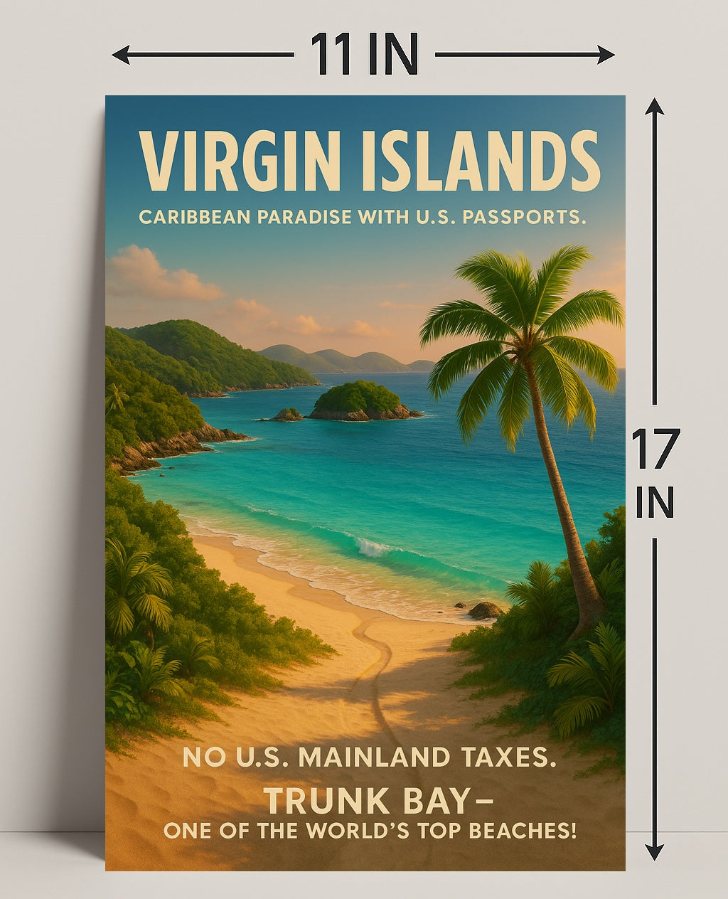 Bring the sun-drenched turquoise waters and swaying palms of the Virgin Islands into your home with the Virgin Islands Caribbean Paradise Poster from PosterGoat. This vintage-inspired travel poster captures Trunk Bay’s legendary shoreline—soft golden sand, crystal-clear surf, lush green headlands and a solitary palm framing the view—perfect for adding wanderlust and warmth to any room.