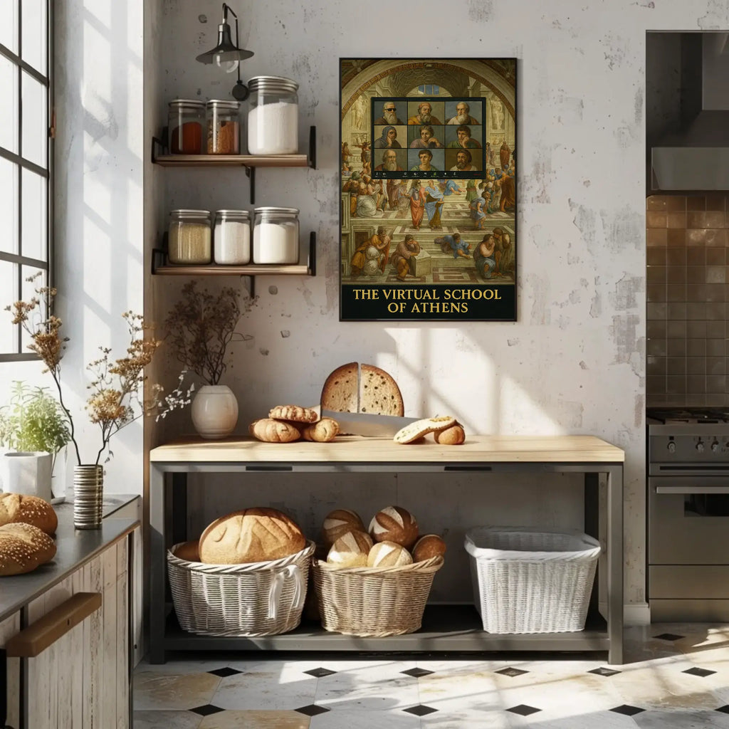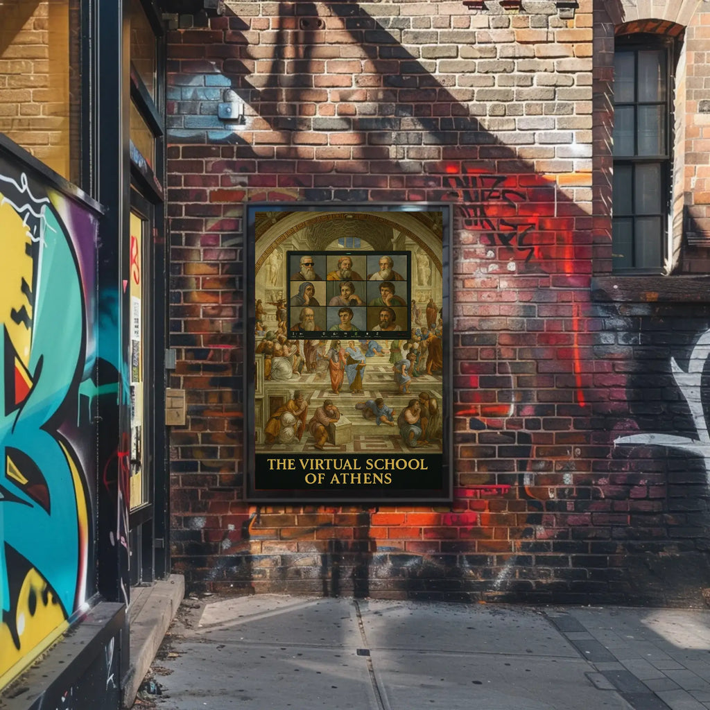 Bring witty, conversation-starting art to your walls with the "Virtual Renaissance Humor with Philosophers Pop Culture Poster" from PosterGoat. This digital reinterpretation of Raphael's classic "The School of Athens" drops ancient Greek philosophers into a modern video-call grid, merging Renaissance architecture and earthy, muted tones with playful, contemporary satire.