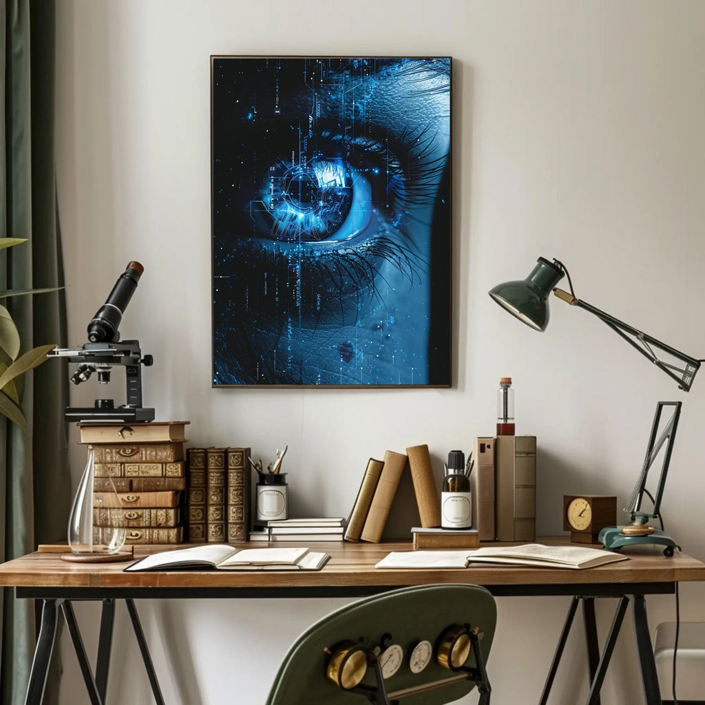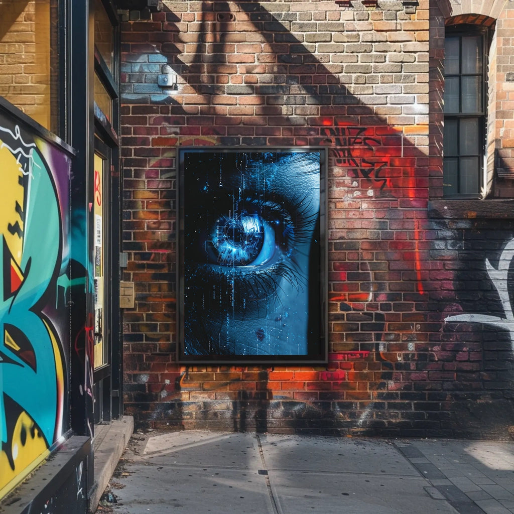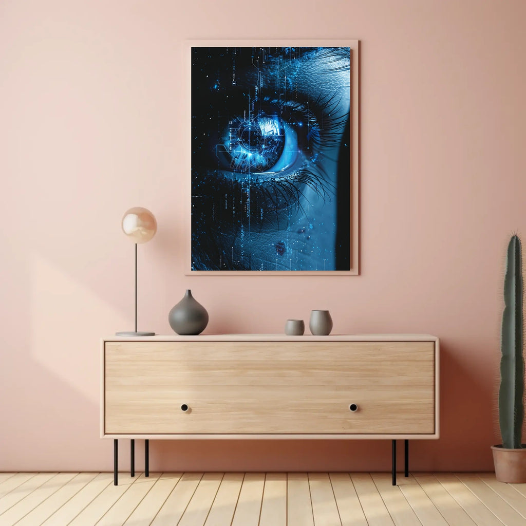 Intro: Dive into a future-forward visual that fuses human perception with digital insight. This striking poster blends a close-up human eye with digital elements, delivering a bold statement piece that captivates tech enthusiasts and futurists seeking visionary art for modern spaces and creative environments.